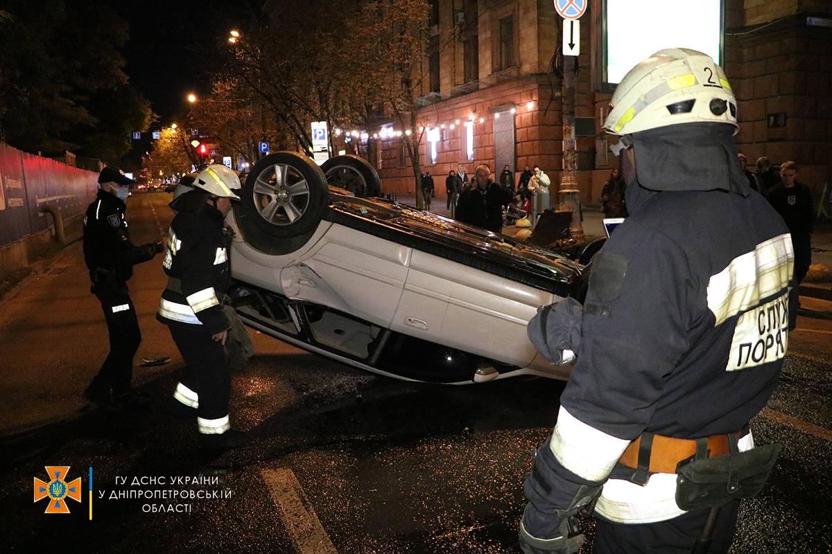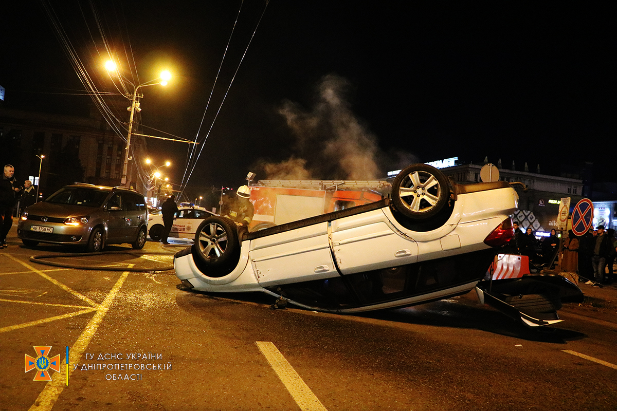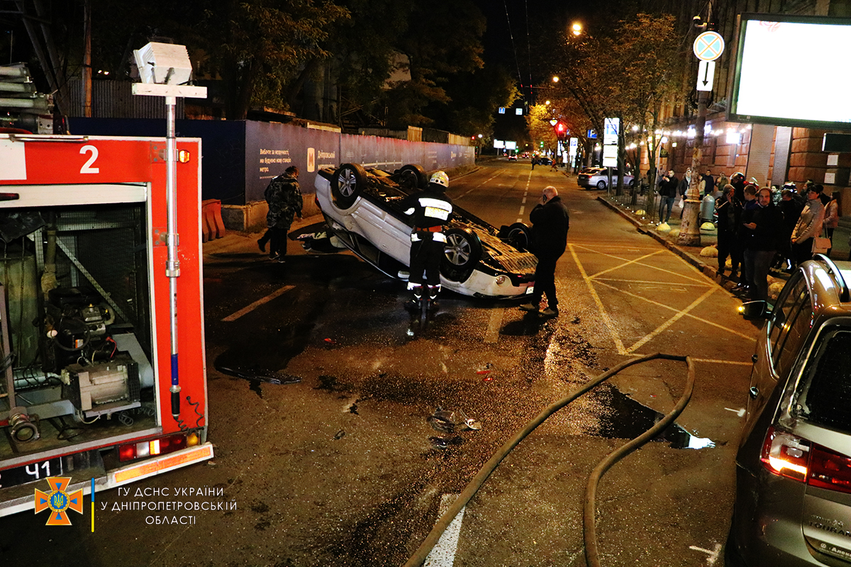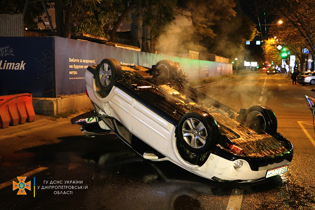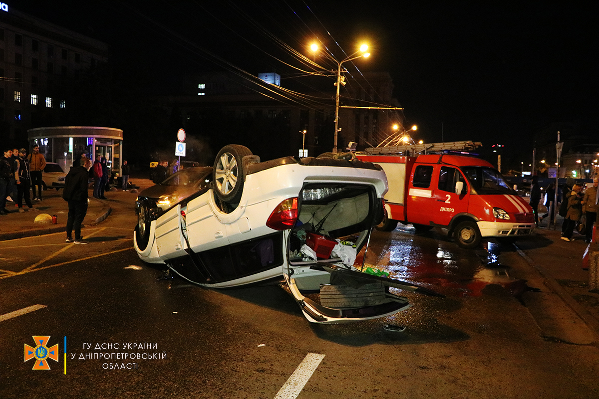 Як повідомляє обласна Служба порятунку, на проспекті Дмитра Яворницького у Шевченківському районі водій Subaru перевищив швидкість, намагаючися обігнати автівки, та протаранив Volkswagen та Hyundai. Після цього авто "гонщика" перекинулося.
