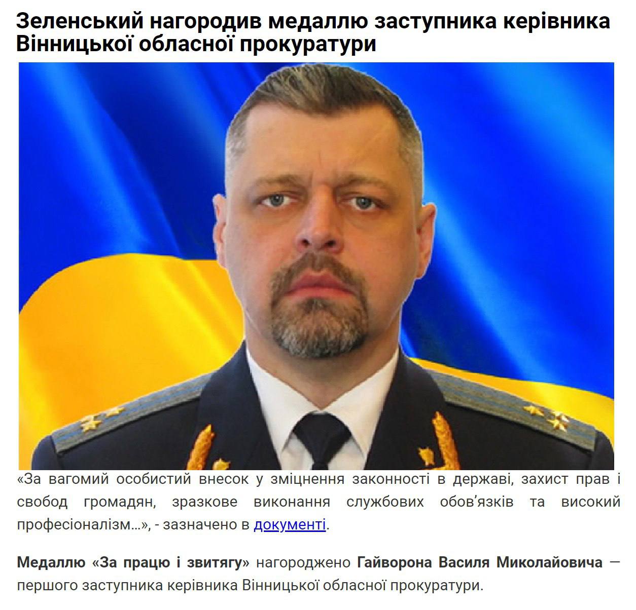 Довідково: 1 грудня 2021 року Президент України В.О. Зеленський нагородив медаллю «За працю і звитягу» Гайворона Василя Миколайовича - першого заступника керівника Вінницької обласної прокуратури.