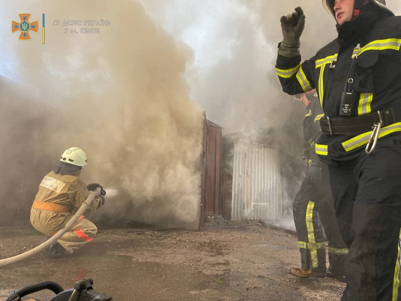 У Голосіївському районі Києва загорілась двоповерхова будівля. Вогонь перекинувся на гаражі.