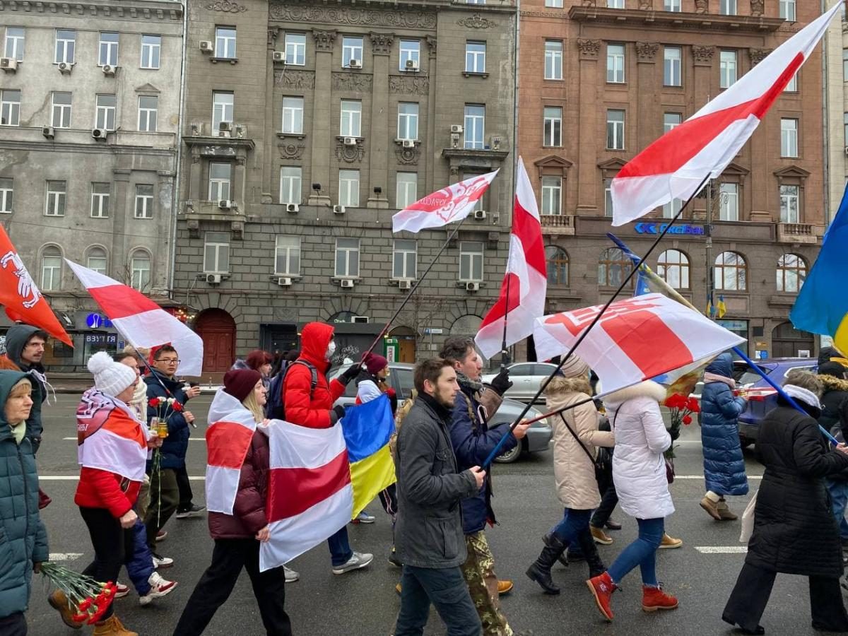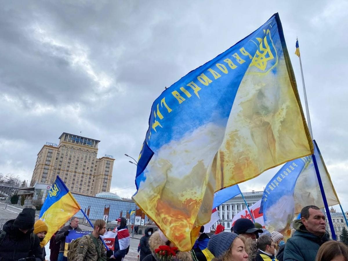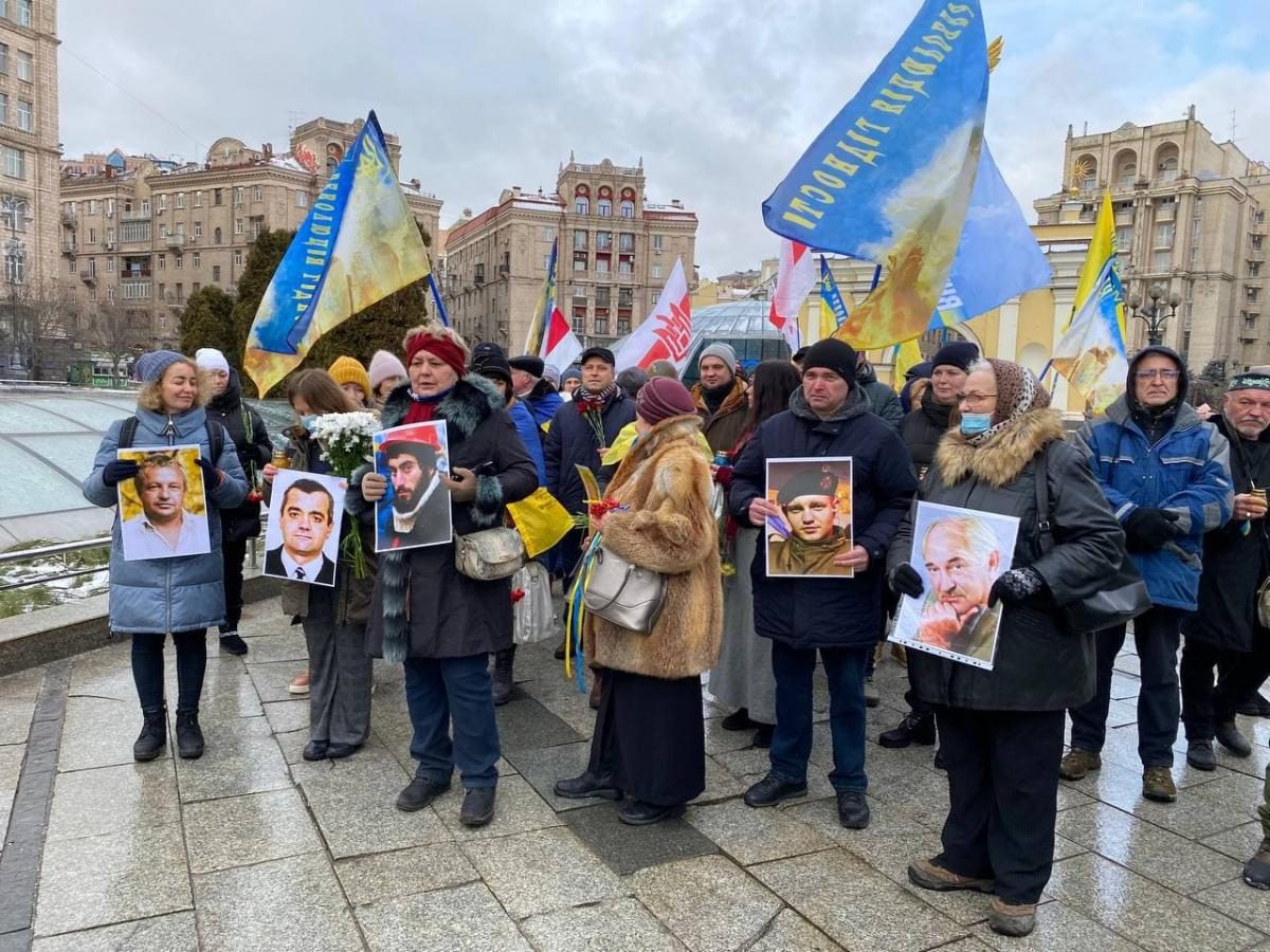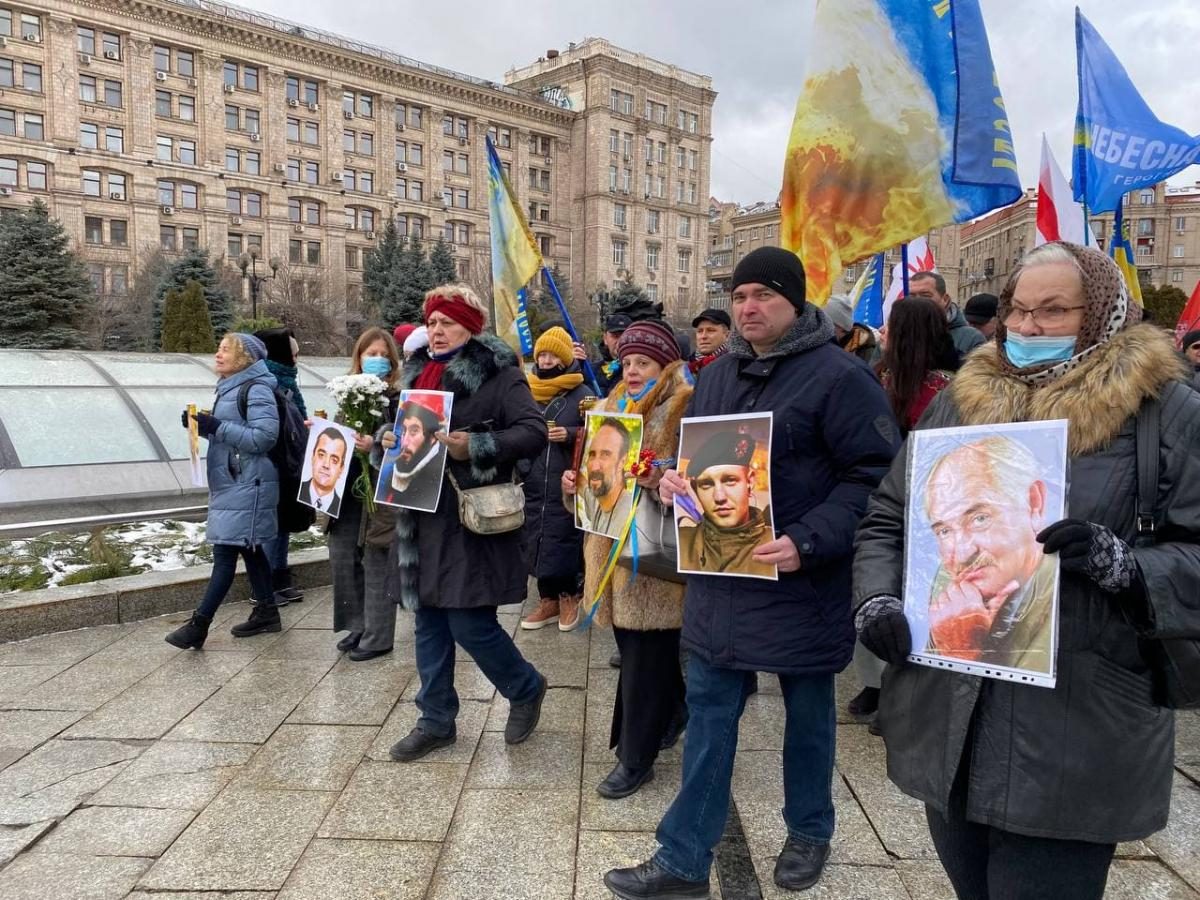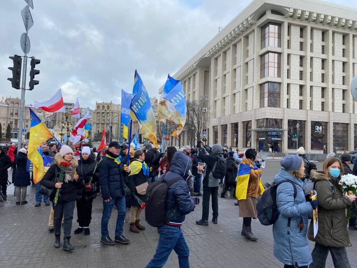 Вони тримали прапори з написами: "Революція Гідності" та "Небесна Сотня", а також портрети вбитих активістів Майдану.