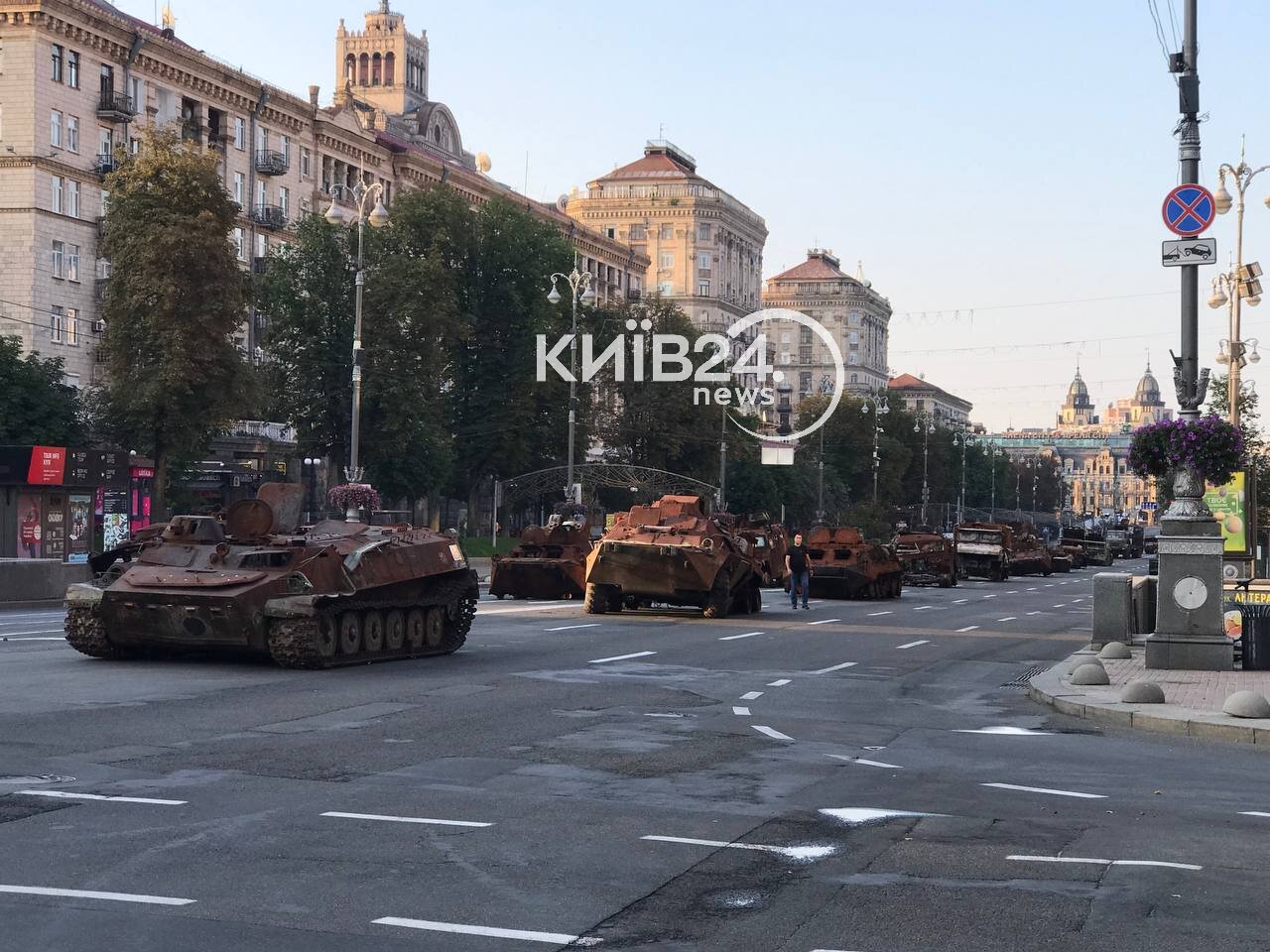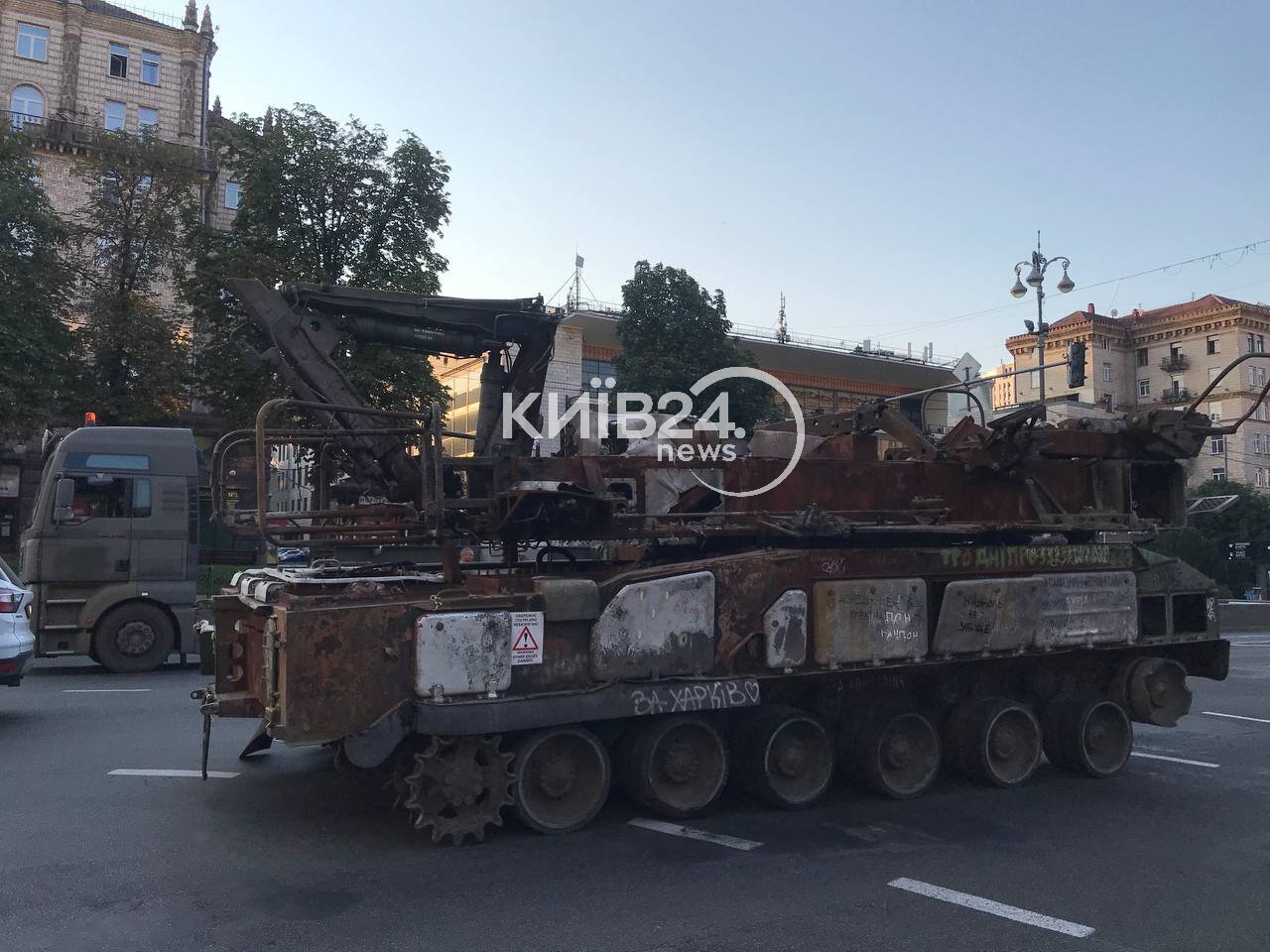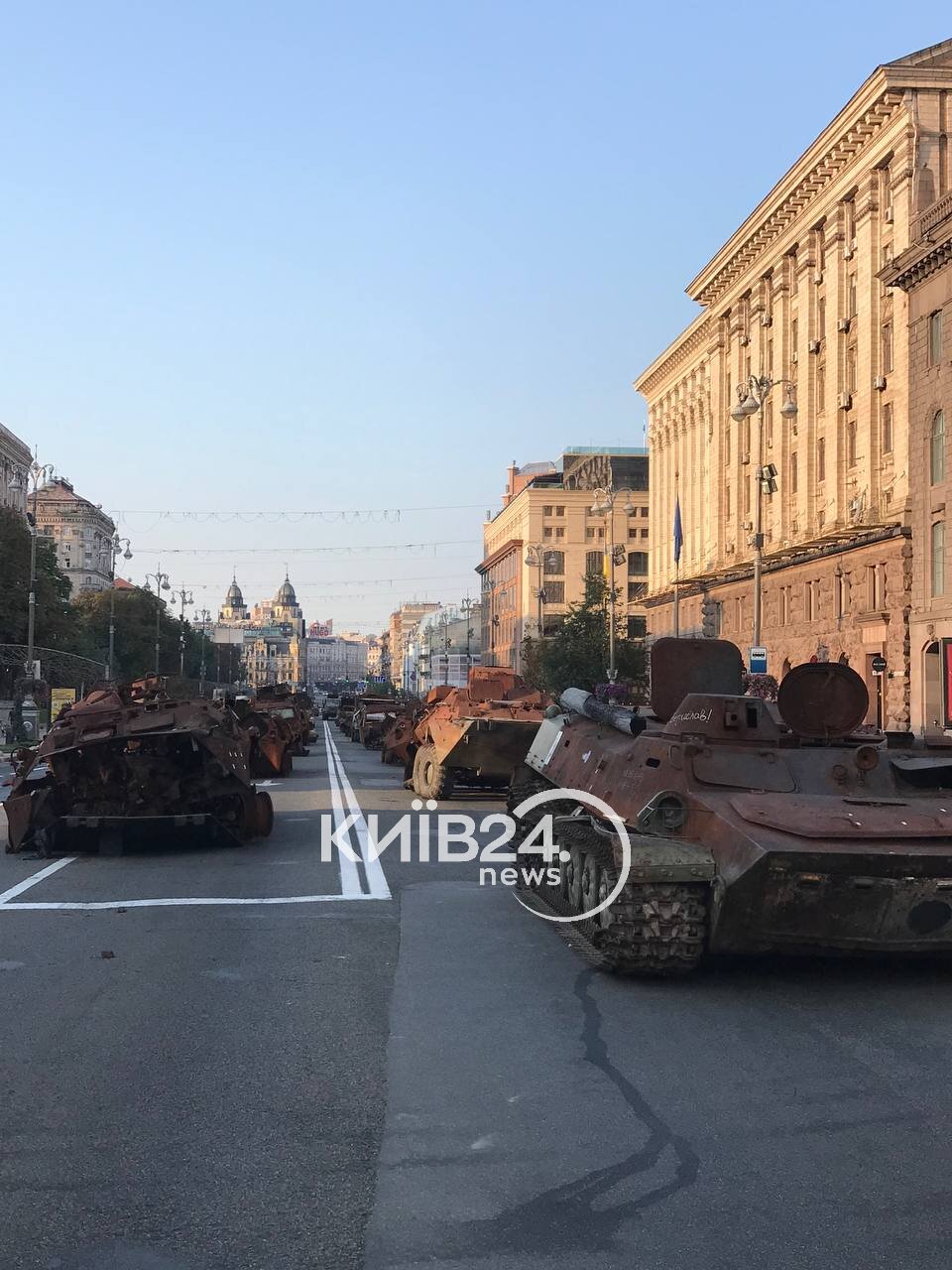 Це пов'язано з тим, що у столиці до Дня Незалежності планують провести виставку зруйнованої техніки російської армії. Саме сьогодні на Хрещатику розвантажують російський іржавий металобрухт. Тут можна побачити танки Т90, Т80, Т72 різних модифікацій, БТРи, реактивну та самохідну артилерію.