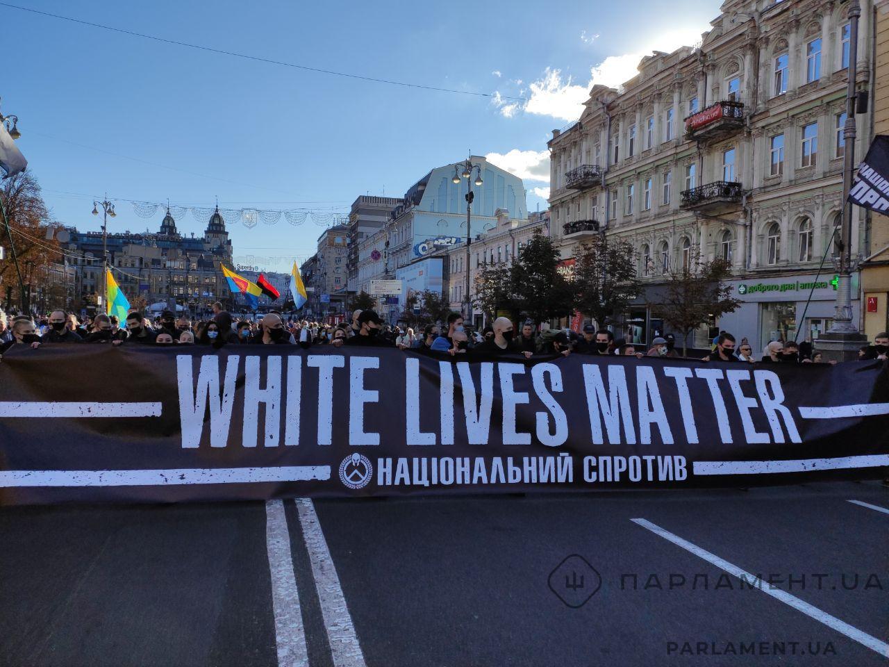 До кінця колони маршу примкнула праворадикальна партія «Національний опір» з банером “White Lives Matter”. Вони вважають, що нині білі люди страждають від дискримінації та злочинів на расовому ґрунті.