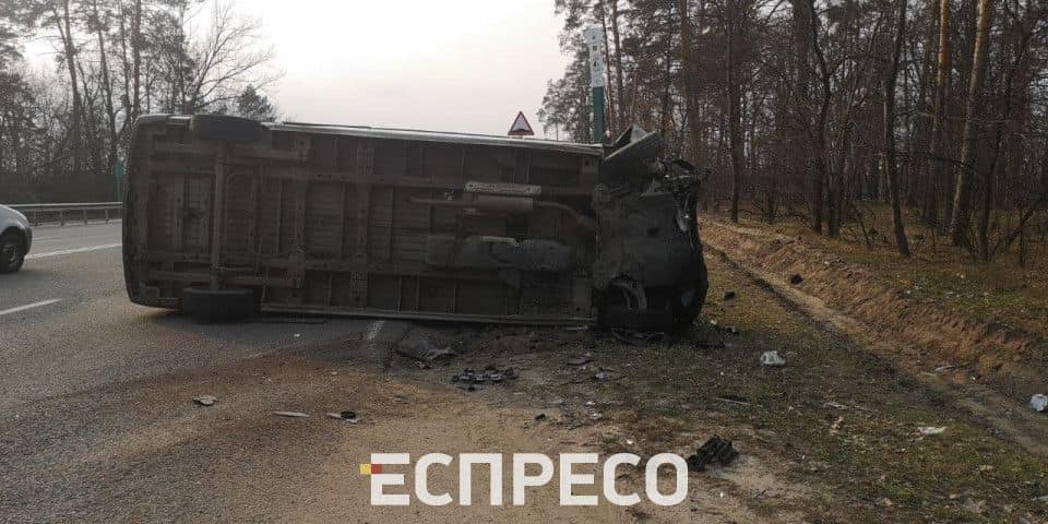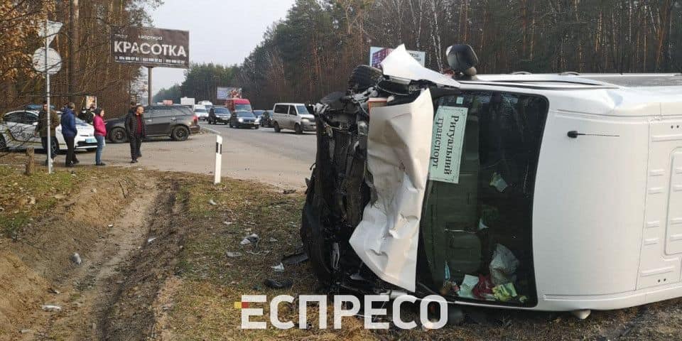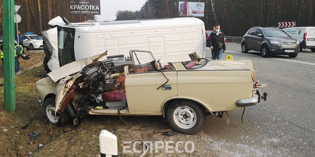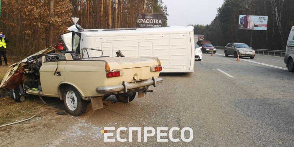 Під Києвом на Ірпінській трасі сталася аварія за участю автомобіля "Москвич" та мікроавтобуса-катафалка Renault Master.