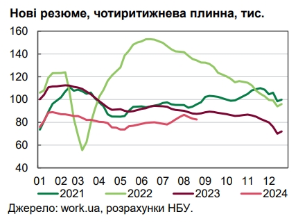Згідно з даними НБУ, активізація економічної діяльності у серпні 2024 року спричинила подальше зростання кількості вакансій на ринку праці. Найбільше збільшення кількості вакансій спостерігалося у сферах охорони та безпеки (у 4,6 рази порівняно з минулим роком), телекомунікаціях (на 45%) та охороні здоров'я (на 34%).