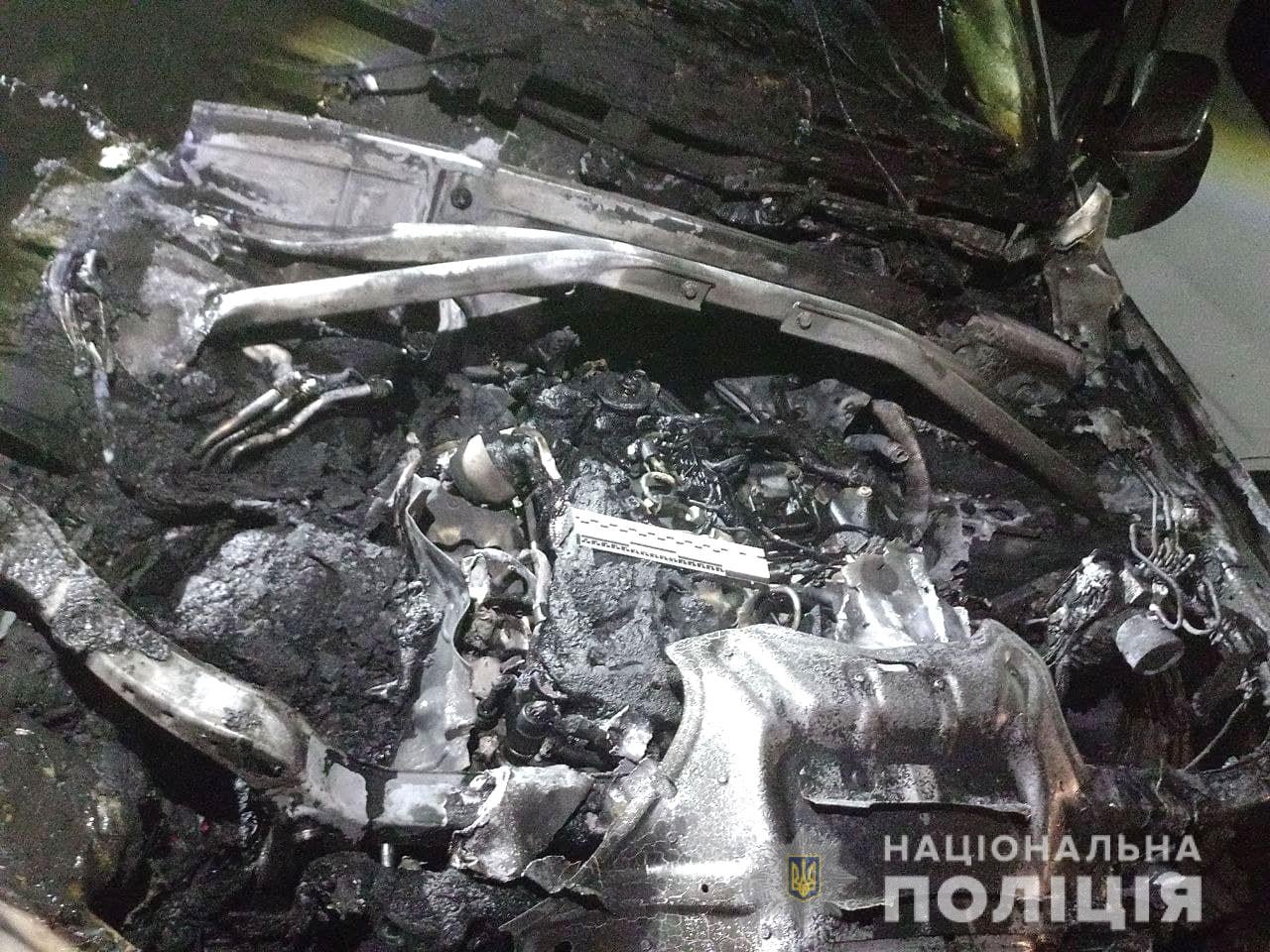 Зазначається, що вогнем пошкоджено лакофарбове покриття, лобове скло, дзеркала та моторний відсік автомобіля.