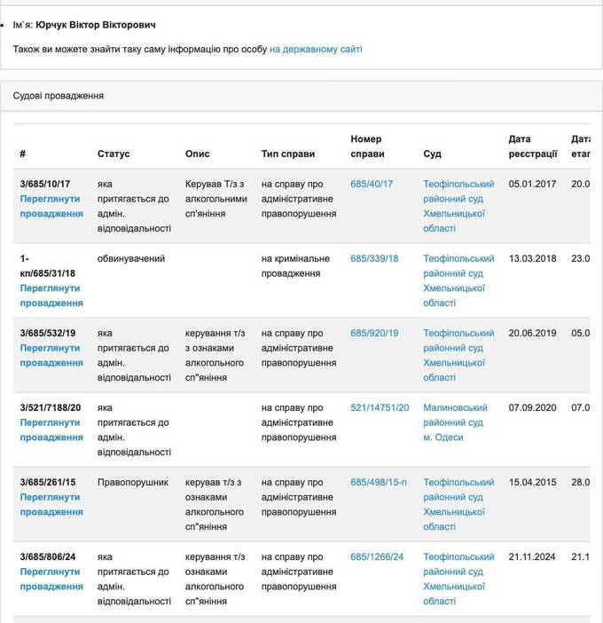 Після цієї заяви користувачі виявили в судовому реєстрі 7 справ проти Юрчука за водіння в стані алкогольного сп’яніння. Перша справа датується 2015 роком, а остання – січнем цього року.