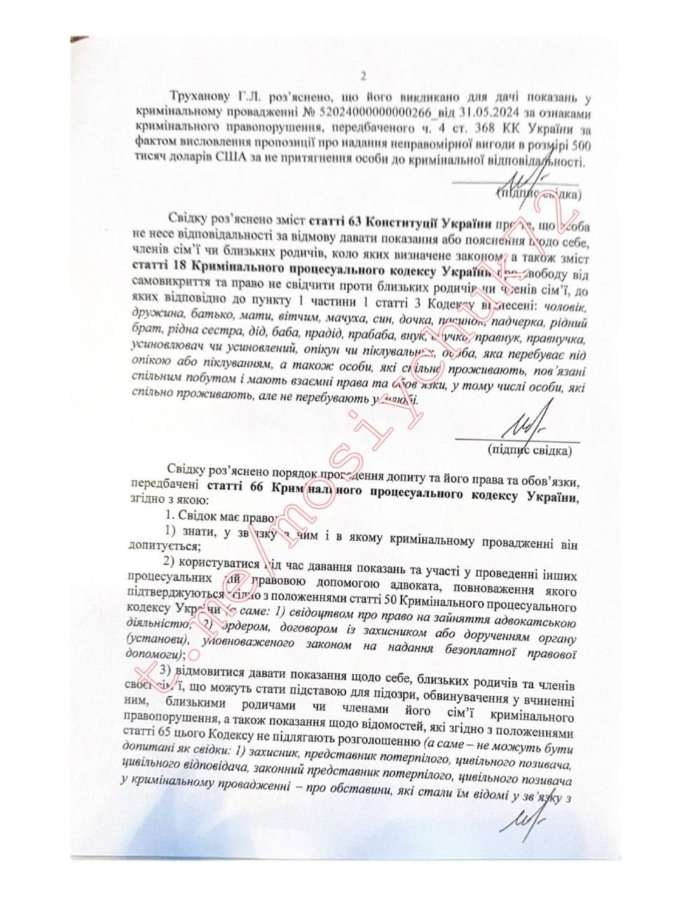 Це зафіксовано у протоколів допиту свідка від 10 вересня 2024 року, а самим свідком і людиною якій пропонували за $ 500 тис закрити справу являється мер Одеси Труханов Геннадій Леонідович.