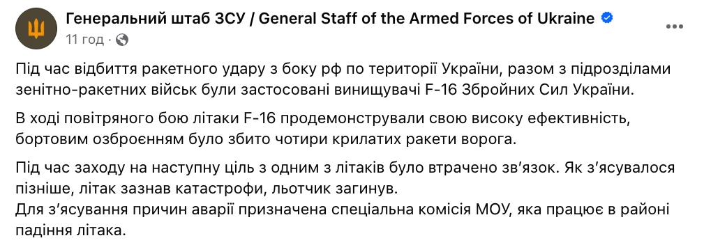 До цього телеканал CNN з посиланням на джерело в українському військовому відомстві повідомив про катастрофу літака F-16 та смерть провідного українського пілота з позивним "Мунфіш" Олексія Меся.