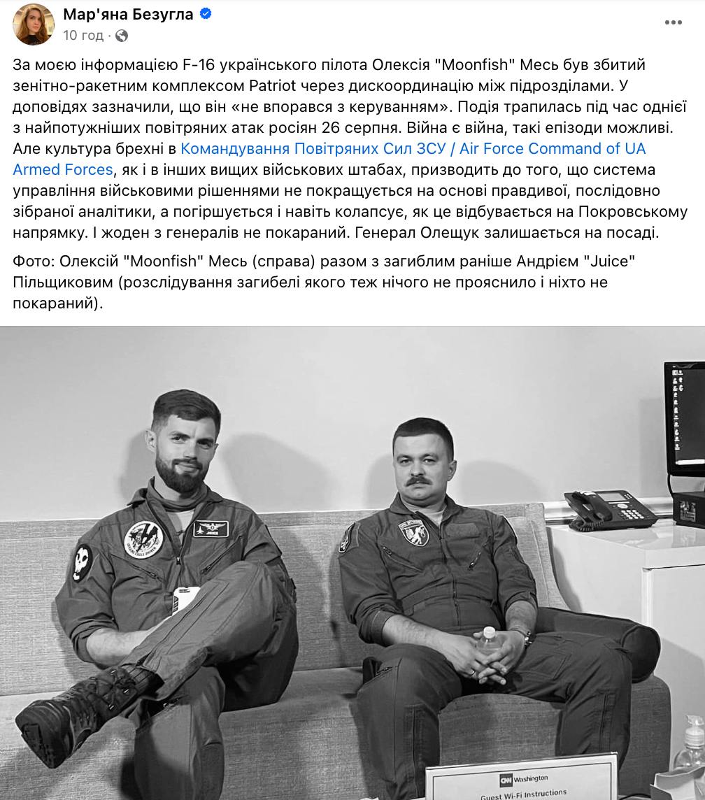 Крім цього, нардеп Мар'яна Безугла заявила на своїй Facebook-сторінці, що F-16 українського пілота Олексія "Moonfish" Меся був збитий зенітно-ракетним комплексом Patriot через дискоординацію між підрозділами.