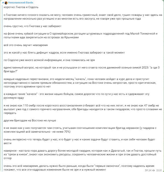 "Дуже сумно, що Гнатова у нас забирають. На тлі дуже х*вої ситуації в Старомайорському, ротації штурмових підрозділів під Малою Токмачкою та спробами ВДВ закріпитися на островах за Кринки все це дуже звучить не вчасно. Це ж який у нас,бл*дь, є дефіцит кадрів, якщо саме Гнатова забирають у такий момент", – пише "Ваньок".