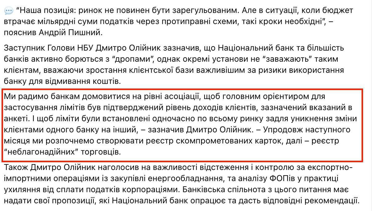 "Ми радимо банкам домовитися на рівні асоціації, щоб головним орієнтиром для застосування лімітів був підтверджений рівень доходів клієнтів, вказаний в анкеті. І щоб ліміти були встановлені одночасно по всьому ринку задля уникнення зміни клієнтами одного банку на інший, – зазначив Дмитро Олійник. – Упродовж наступного місяця ми розпочнемо створювати реєстр скомпрометованих карток, далі – реєстр “неблагонадійних” торговців".
