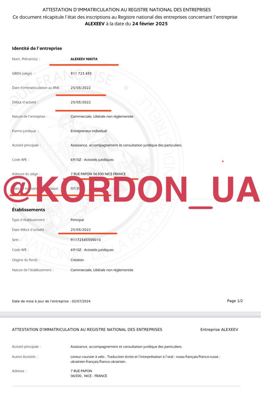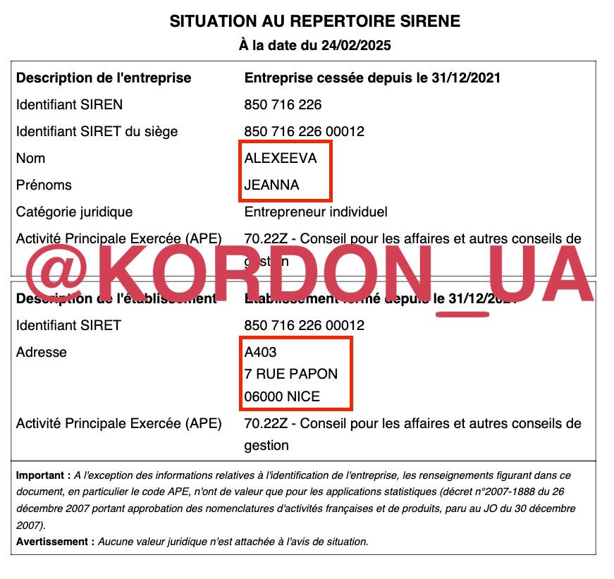 З 2019 по 2021 дружина була індивідуальним підприємцем у Франції. Надавала консультаційні послуги. В реєстраційних документах зазначена як ALEXEEVA JEANNA, адреса проживання - як і в минулій компанії. В декларації Алєксєєва з цього приводу пусто.