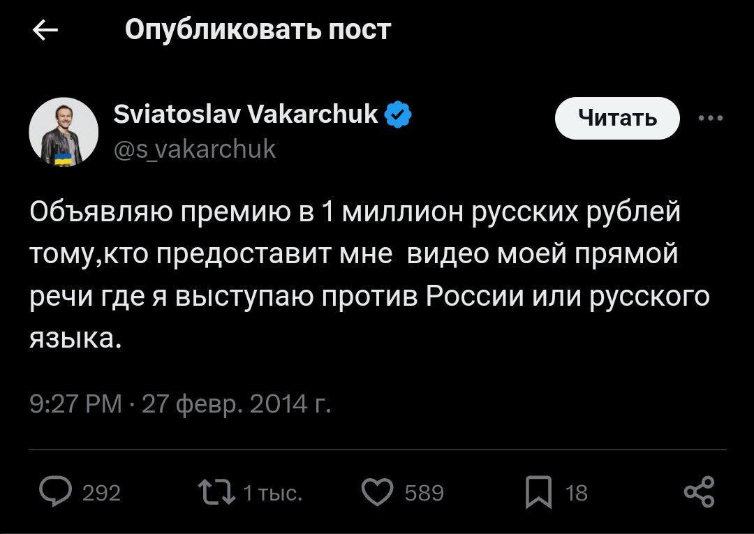 Крім того, у телеграм-каналі Сніданок химери нагадали, що Вакарчук ніколи не був проти Росії чи російської.