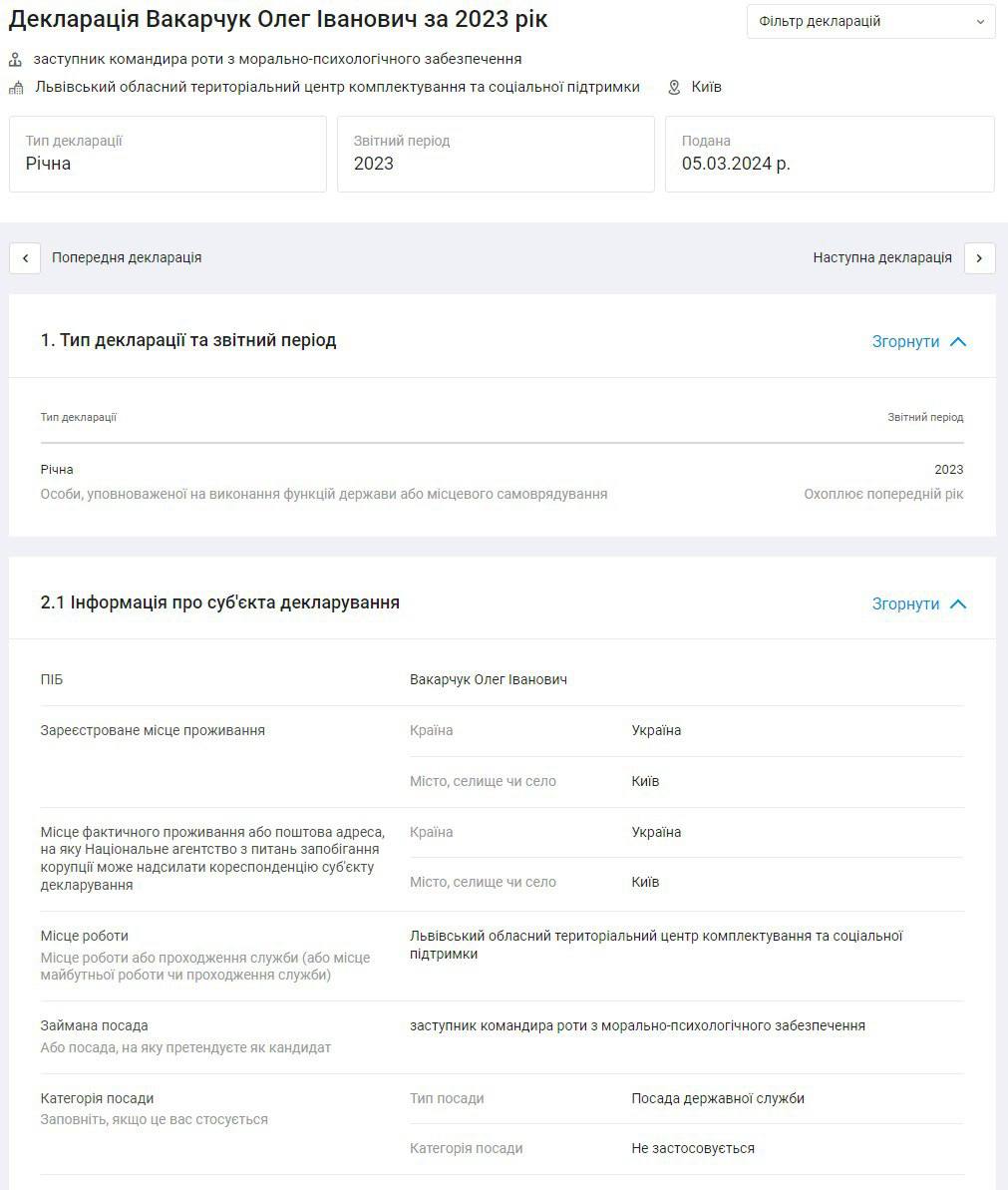 Причину та мотиви звільнення не названо. За 2023 рік Олег Вакарчук заробив 432 тис. грн у ТЦК та ще 100 тис. грн у компанії ТОВ "ДОК ПРОМ", у якої він має корпоративні права. Ця фірма зареєстрована у Київській області та займається оптовою торгівлею.