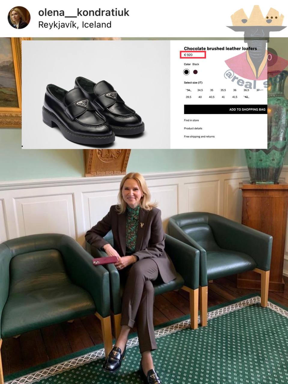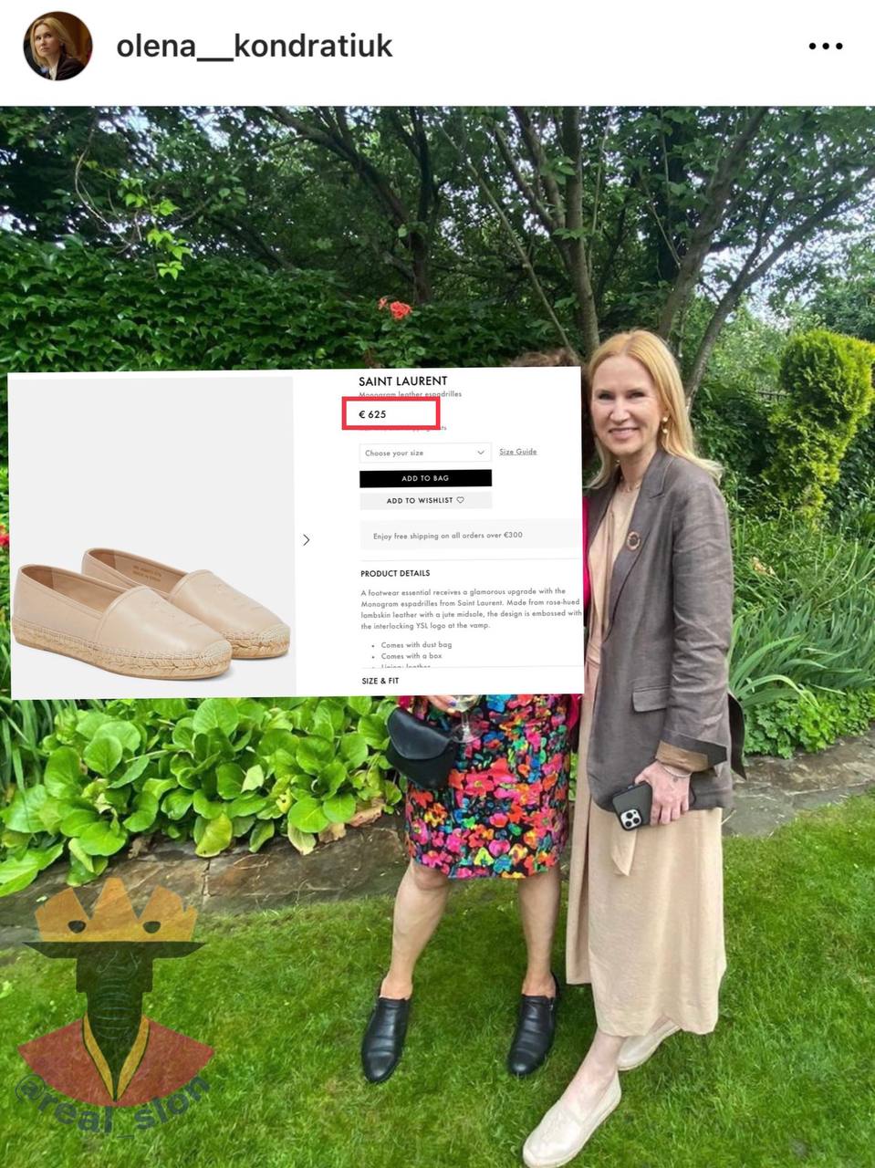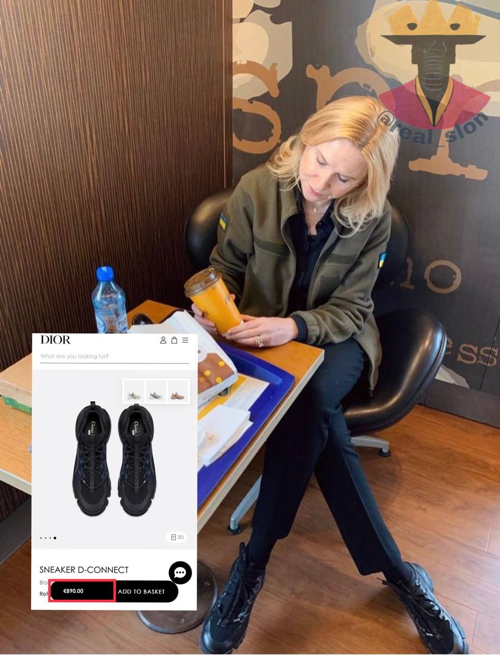 Окремої уваги вартує колекція взуття пані Олени. Лофери від Prada за €920, кросівки Dior за €890, які доповнюють тактичну фліску, еспадрильї від Saint Laurent за €625