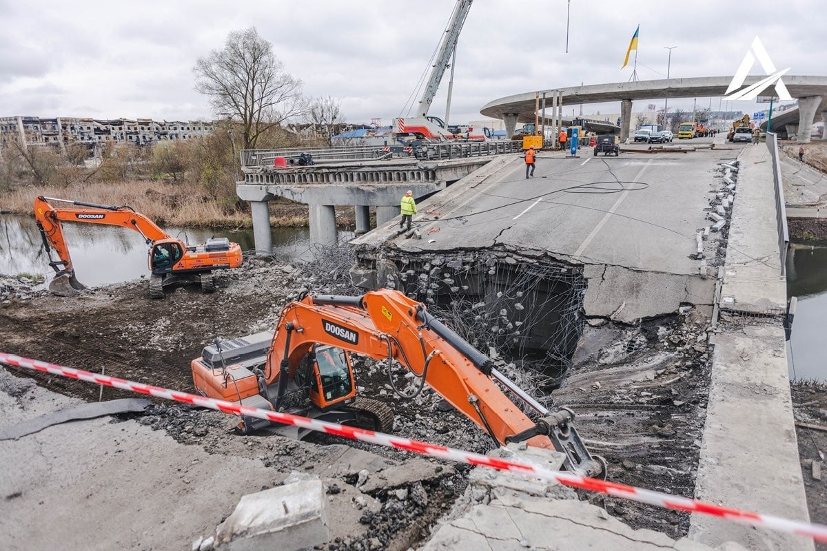 Оперативно почали розчищати трасу, і паралельно будувати тимчасову об'їзну дорогу. У кооперації з військовими за 13 днів звели тимчасову білощебеневу дорогу з переправою через річку Ірпінь та встановили дорожні знаки.