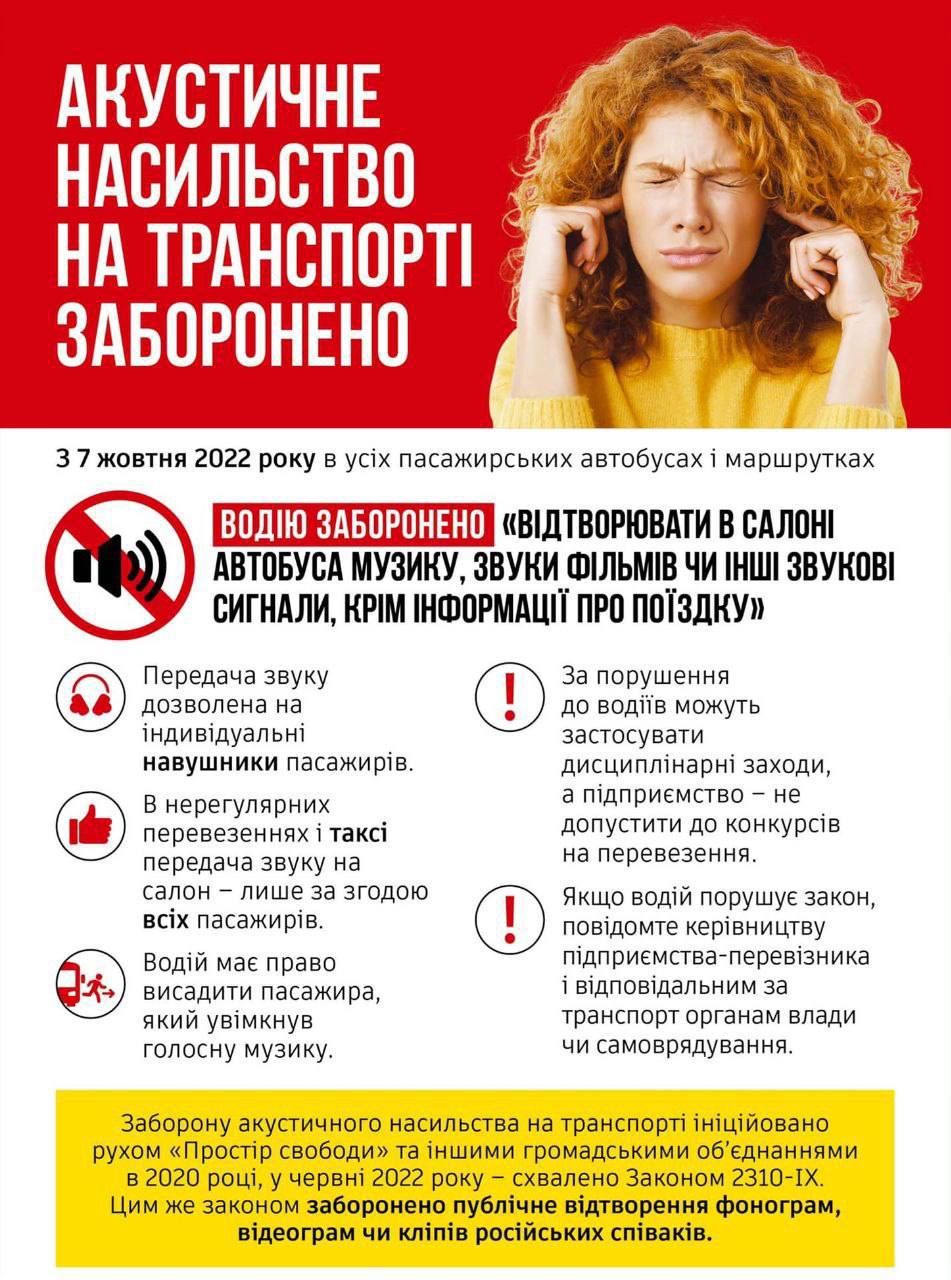 Відповідно до закону 2310-IX про підтримку національного музичного продукту та обмеження публічного використання музичного продукту держави-агресора, який був прийнятий Верховною Радою 19 червня, водіям автобусів та маршруток заборонено вмикати в салоні музику, фільми чи інші звукові сигнали, крім інформації про поїздку.