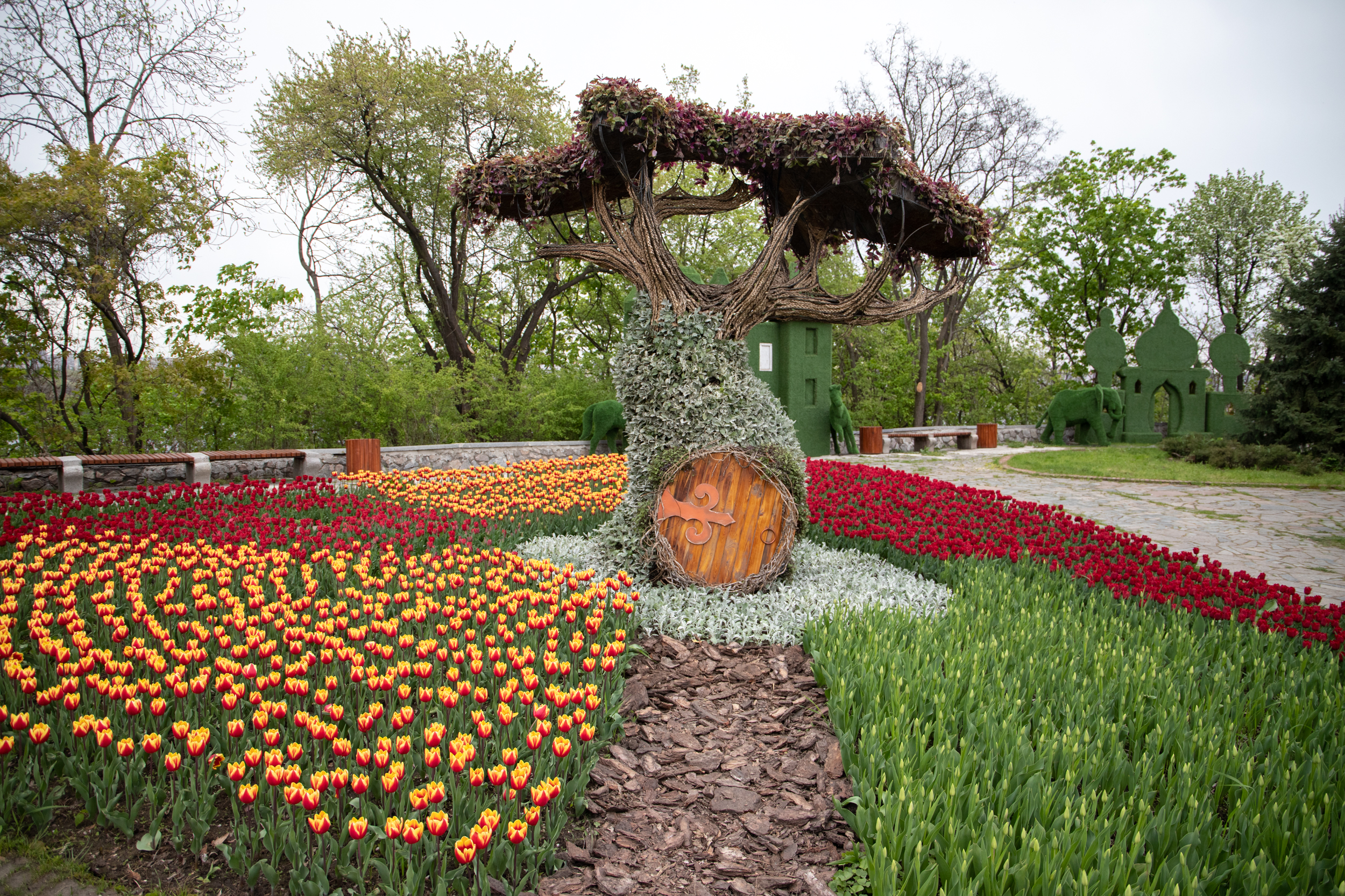Окрім тюльпанів, виставку прикрашають нарциси, гіацинти, крокуси та мускарі. Над створенням композиції працювало понад 15 дизайнерів та 150 працівників управлінь зелених насаджень та компанії-оператора парку "Співоче поле".
