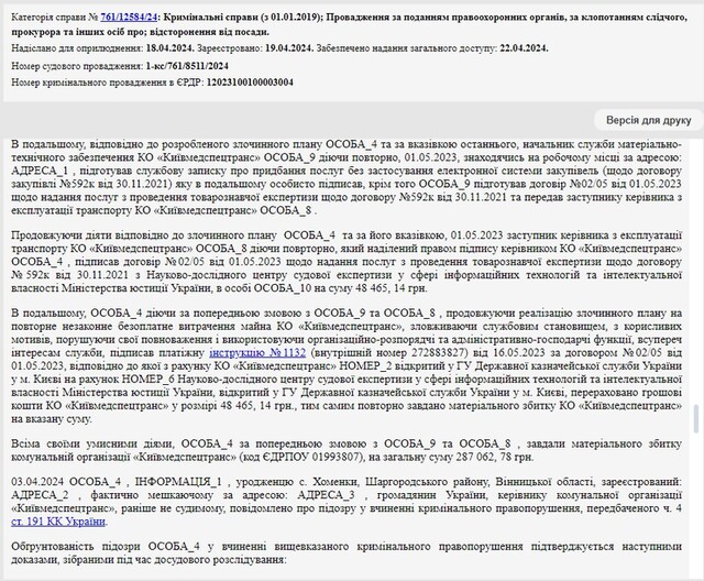 3 квітня 2024 року правоохоронці повідомили про підозру директору КО “Київмедспецтранс” Віталію Безносюку. Йому офіційно інкримінується вчинення злочину, передбаченого вищезгаданою ч. 4 ст. 191 КК України – розтрата бюджетних коштів при реалізації договорів, укладених з установою судових експертиз. Зазначимо, максимальне покарання за цією статтею – до 8 років позбавлення волі.