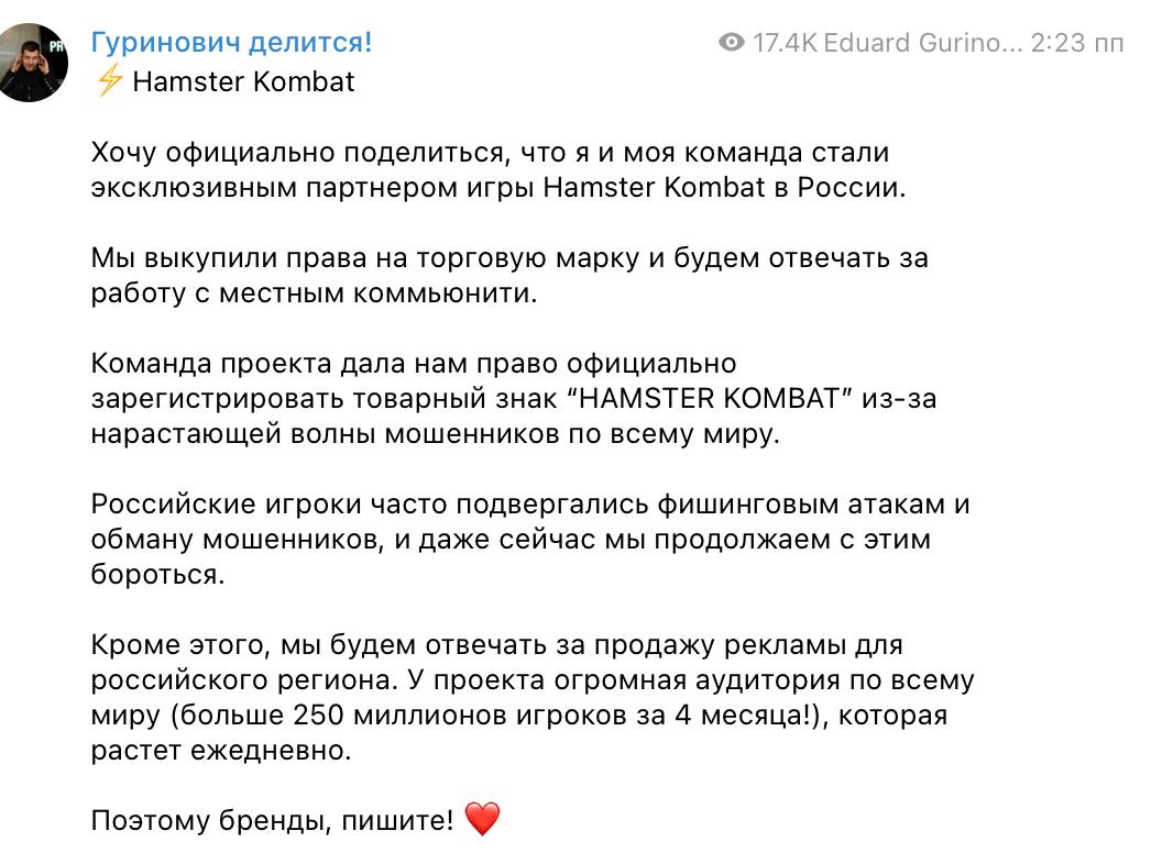За словами Гуриновича, аудиторія гри Hamster Kombat за останні чотири місяці зросла до 250 мільйонів користувачів по всьому світу. Він також зазначив, що проєкт має величезний потенціал і продовжує зростати.