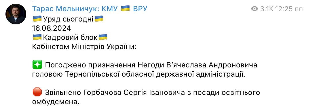 "Погоджено призначення Негоди В’ячеслава Андроновича головою Тернопільської обласної державної адміністрації", - йдеться у повідомленні.