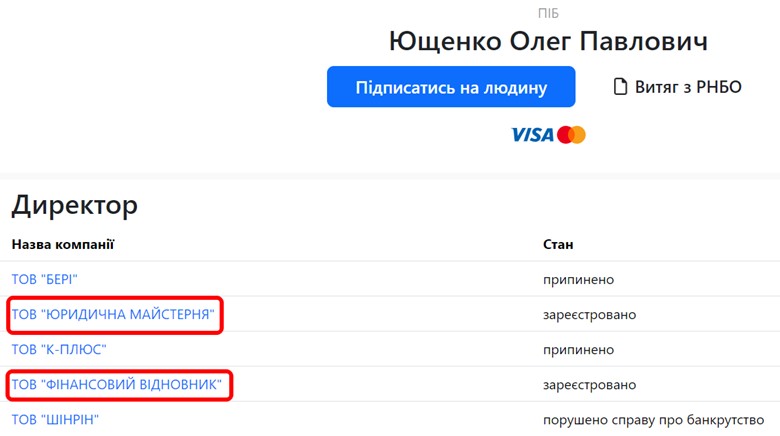 Далі цікавіше, в 3-х з 4-х справ кредитором виступає ТОВ «Юридична Майстерня», а в 4-й справі кредитором є ТОВ «Фінансовий Відновник». З відкритих джерел сайту Опендатабот вбачається, що Засновником и Директором цих двох кредиторів є Ющенко Олег Павлович.