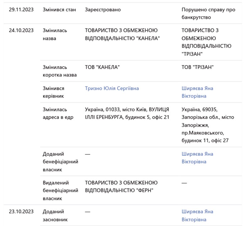 Користуючись даними з реєстру на прикладі ТОВ «Трізан», яке раніше мало назву ТОВ «Канела», продемонструємо механіку процесу, за якою діє вищезазначена ОЗГ: