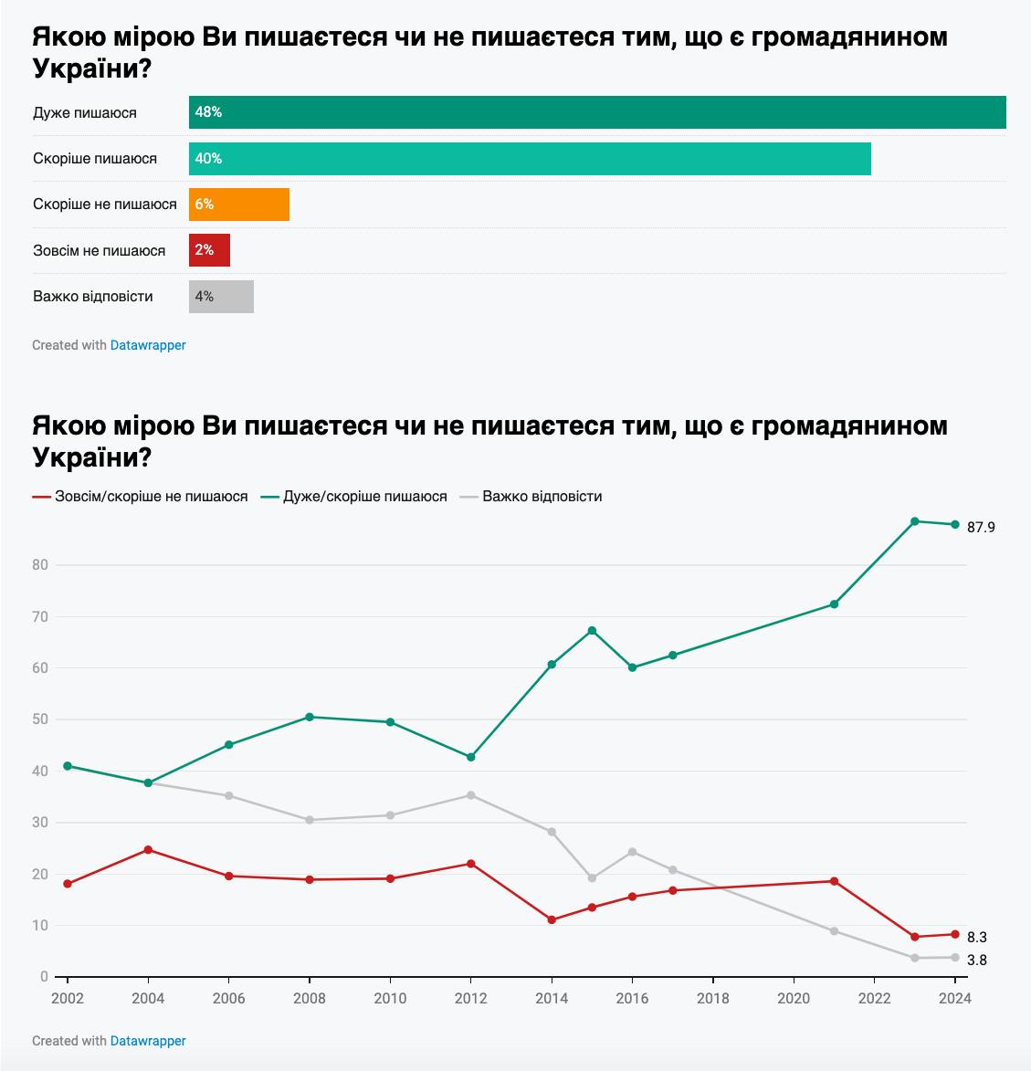 Абсолютна більшість українців (88%) пишаються своїм громадянством. Вже третій рік поспіль гордість за своє громадянство перебуває на майже однаково високому рівні (2022 р. – 90,5%, 2023 р. – 88,5%, 2024 р. – 88%), що є найвищими показниками за роки соціологічного моніторингу. Такий рівень гордості присутній серед представників усіх вікових груп.