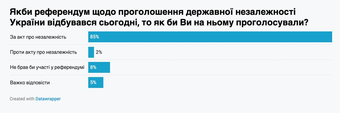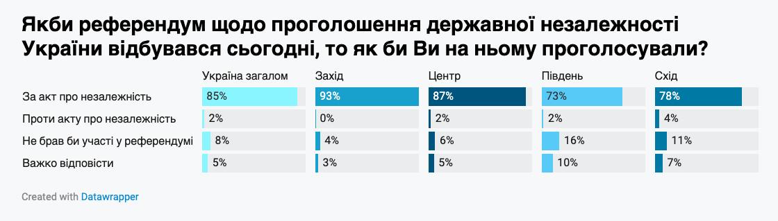 Найбільша підтримка незалежності спостерігається на Заході України (93%), в Центрі – 87%, на Сході – 78%, а на Півдні – 72%. Проти незалежності виступають лише 2% респондентів по всій країні, причому на Заході таких менше 1%, а на Сході – близько 4%.