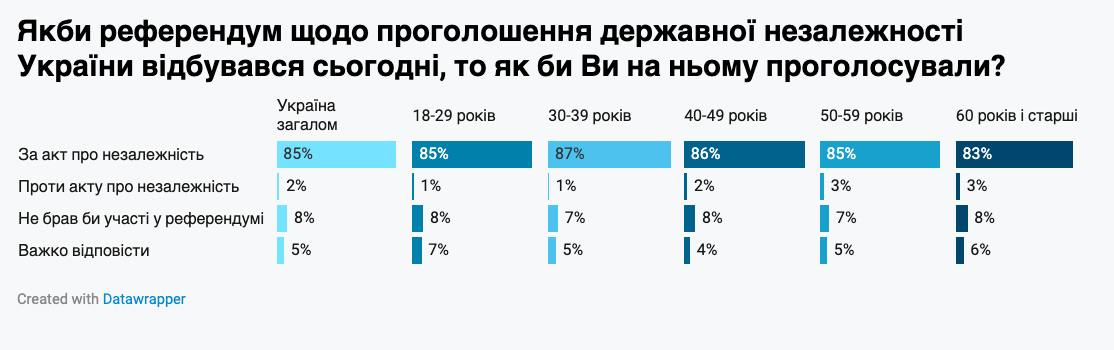 Підтримка незалежності є високою серед усіх вікових груп. Так, серед молоді цей показник становить 85%, а серед людей віком 60 років і старше – 83%. Підтримка незалежності поширюється як на мешканців міст (86%), так і на жителів сільської місцевості (84,5%).