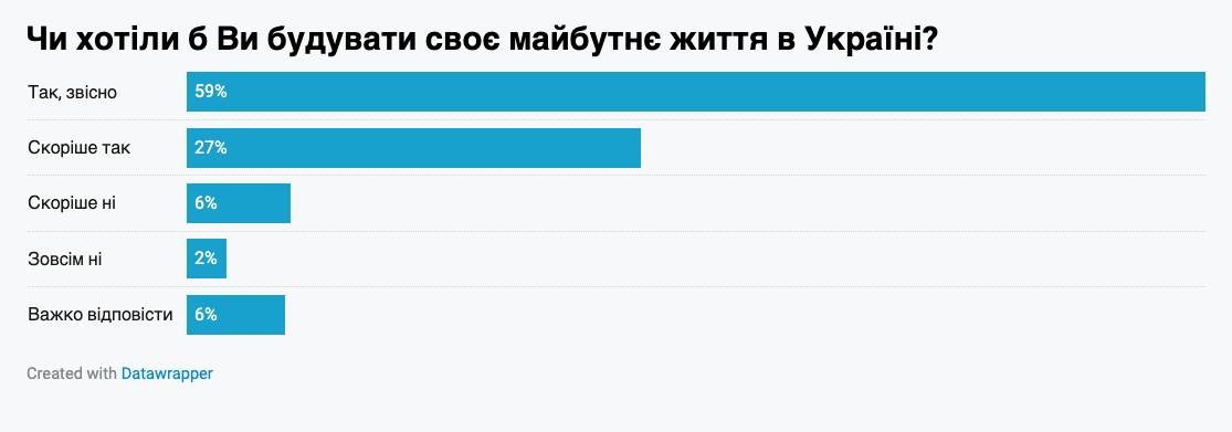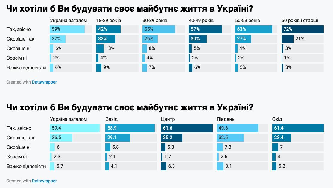 Більшість українців (86%) планують будувати своє майбутнє в Україні, причому 59% однозначно налаштовані залишатися в країні. Це бажання зростає з віком: серед молоді залишитися в Україні хочуть 74%, тоді як серед людей віком 50-59 років – 90%, а серед найстаршої вікової групи – 93%.