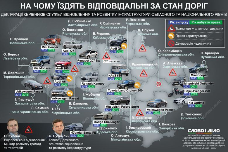 "Слово і діло" досліджувало декларації чиновників, які займаються розвитком інфраструктури, зокрема дорожнього покриття, і на основі цього склало інфографіку, де представлені автомобілі, на яких вони їздять. Серед задекларованих транспортних засобів зустрічаються як бюджетні моделі, так і розкішні Audi Q7.