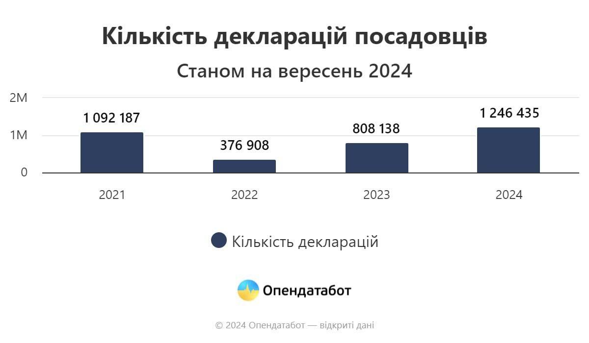 1 246 435 декларацій було подано до 11 вересня 2024 року за даними Національного агентства з питань запобігання корупції. Кількість виправлених документів порівняно з минулим роком зросла майже в 2 рази, повідомляє Opendatabot.