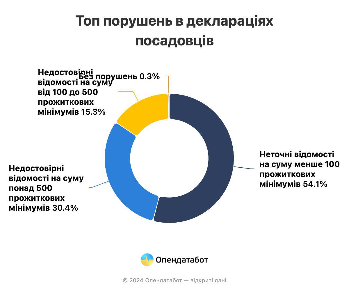 Серед повністю вивчених декларацій 46% містять в собі порушення на загальну суму 1 856,1 млн грн. Загалом усі помилки пов’язані із неправильно вказаними сумами в деклараціях. Різниця полягає у розмірах неточностей: загубилися суми менші або більші за 500 прожиткових мінімумів.