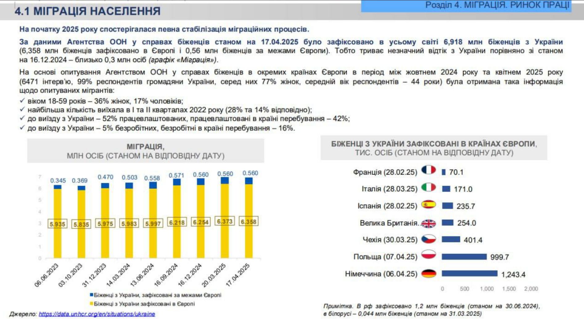 З початку 2025 року з України виїхали ще 100 тисяч осіб. Загальна кількість українців за кордоном, які мають статус біженців, становить 6,918 млн осіб.