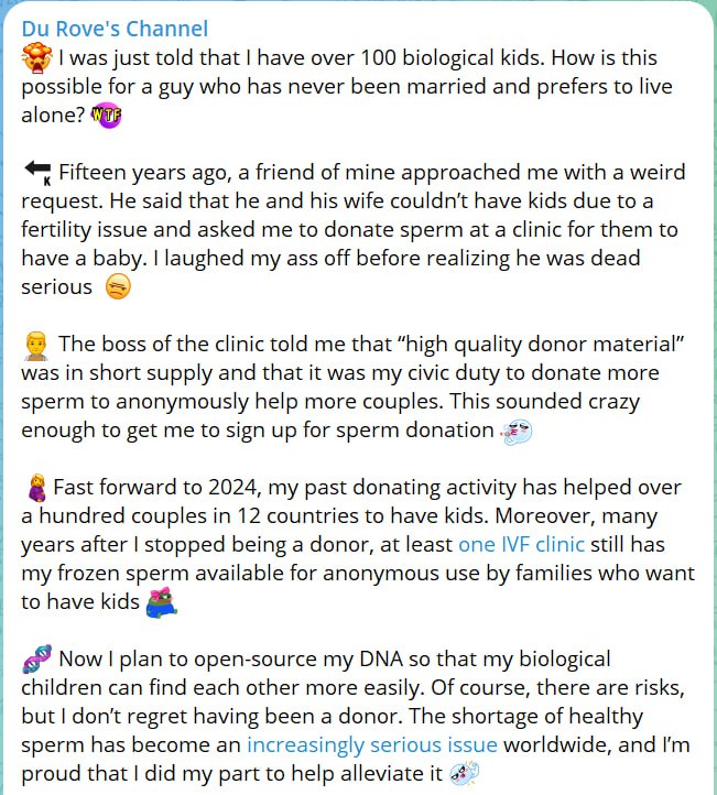 Як повідомив Дуров у своєму Telegram-каналі, 15 років тому він здавав сперму до клініки, яка займається штучним заплідненням. З таким проханням до нього звернувся його друг, який з дружиною не міг мати дітей через проблеми з фертильністю. Спочатку Дуров не сприйняв серйозно його прохання, але зробив це.