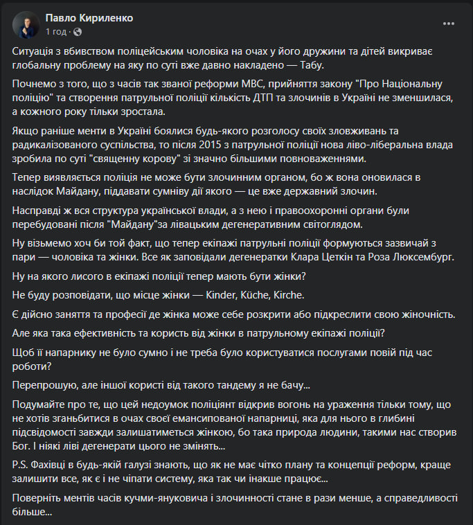 "Цей недоумок поліціянт відкрив вогонь на ураження тільки тому, що не хотів зганьбитися в очах своєї емансипованої напарниці, яка для нього в глибині підсвідомості завжди залишатиметься жінкою, бо така природа людини, такими нас створив Бог. І ніякі ліві дегенерати цього не змінять", – написав Кириленко.
