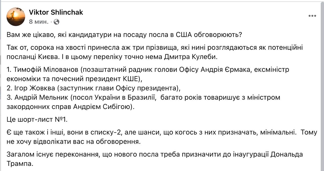 Водночас нардеп Олексій Гончаренко повідомляє, що заступник голови ВП Ігор Жовква – головний кандидат на заміну Маркарової на посаді посла України у США.