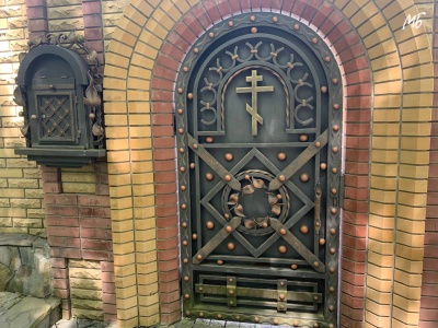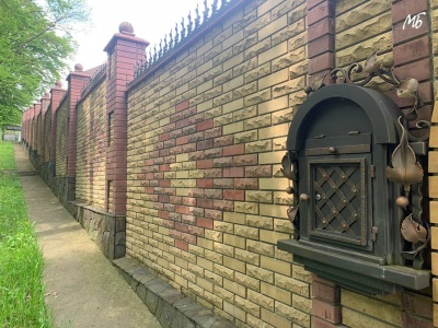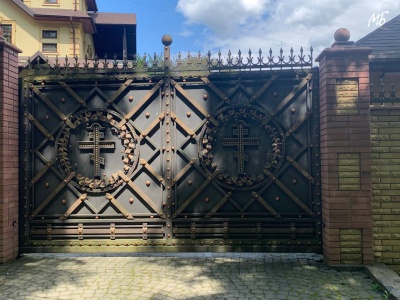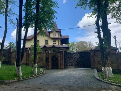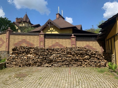 Будинок огороджений високим парканом - 2,5-3 метри. Головна брама та хвіртка прикрашені кованими хрестами і кованими елементами декору. Трішки нижче головного входу лежать складені дрова.