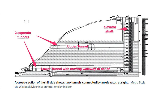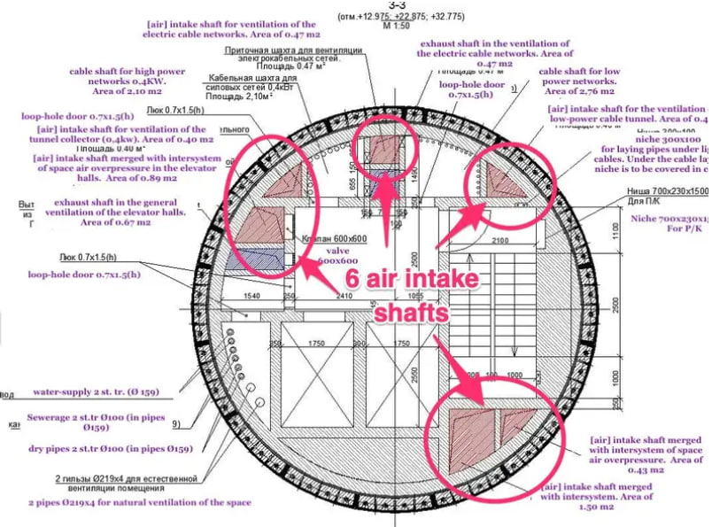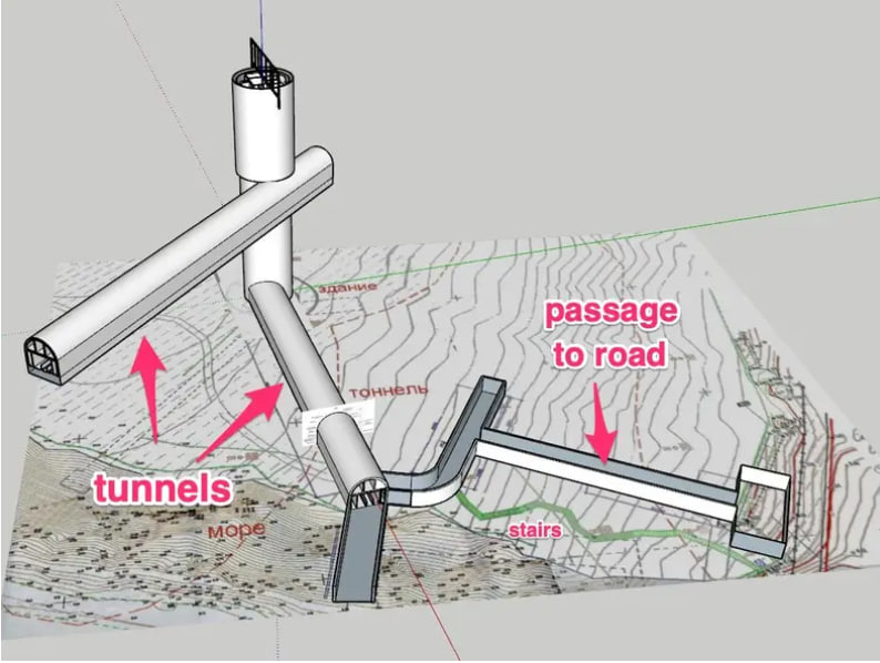 На малюнках зокрема видно шість окремих вентиляційних шахт для подачі повітря. Поруч із тунельним комплексом є дорога, яку можуть використовувати для доставки вантажів.
