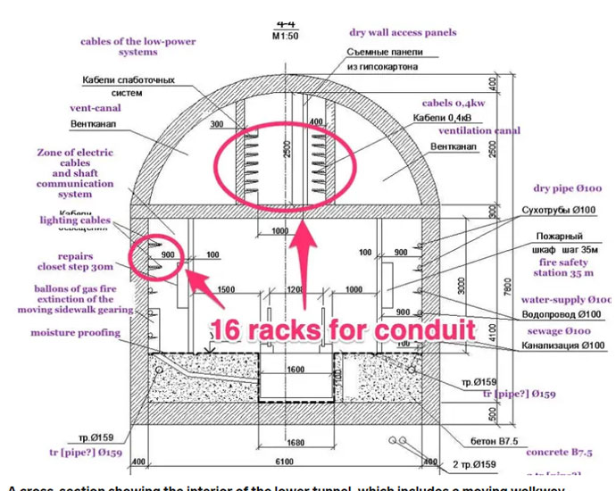 Сам обсяг кабелепроводів, що проходять через нижній тунель, є важливим, оскільки він набагато більший, ніж може знадобитися для роботи внутрішніх систем тунелю.