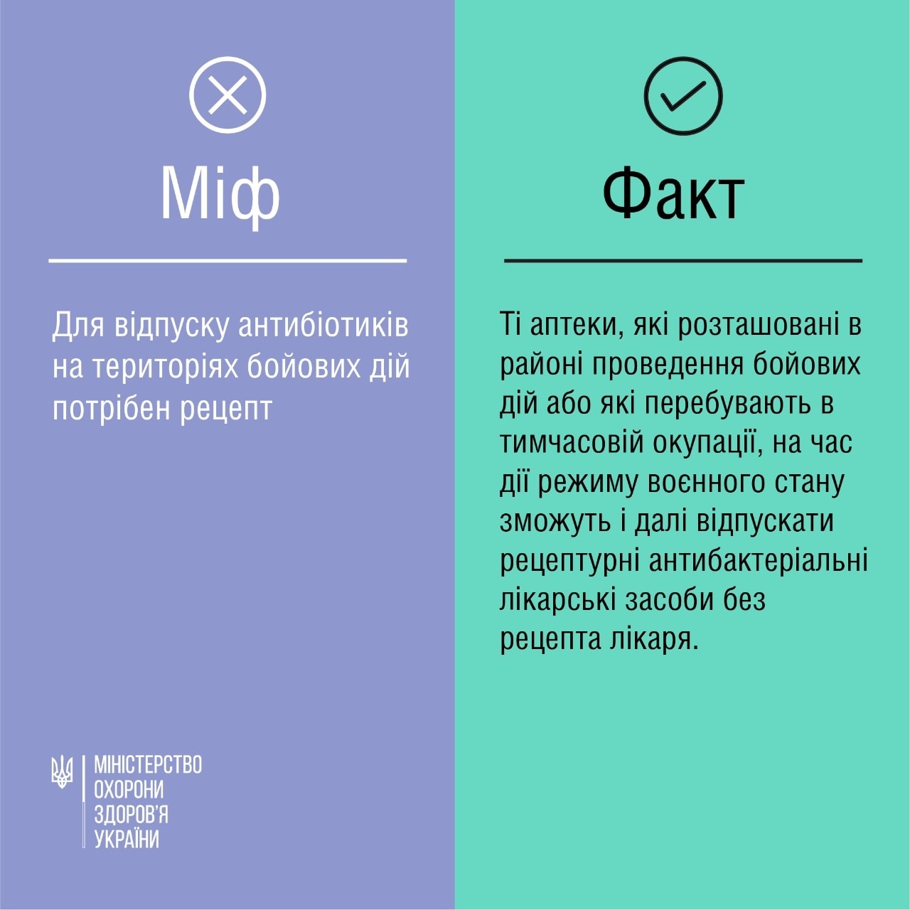 Виключення буде діяти тільки для тих аптек, що знаходяться в межах територіальних громад, розташованих у районі проведення воєнних (бойових) дій або які перебувають в тимчасовій окупації, оточенні (блокуванні), перелік яких затверджений відповідним наказом Міністерства з питань реінтеграції тимчасово окупованих територій. Такі аптеки тимчасово на час дії воєнного стану зможуть відпускати пацієнтам антибіотики без рецепта лікаря.