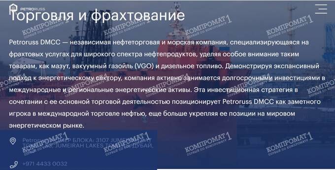 Both 2Rivers DMCC and Petroruss are registered in the DMCC Free Zone in Dubai (Jumeirah Lakes Towers). However, this registration is largely a formality — the companies operate globally. The Petroruss DMCC website states it supplies bunker fuel in ports around the world. There is also a Petroruss Inc in Liechtenstein involved in ship management, although very little is known about it.