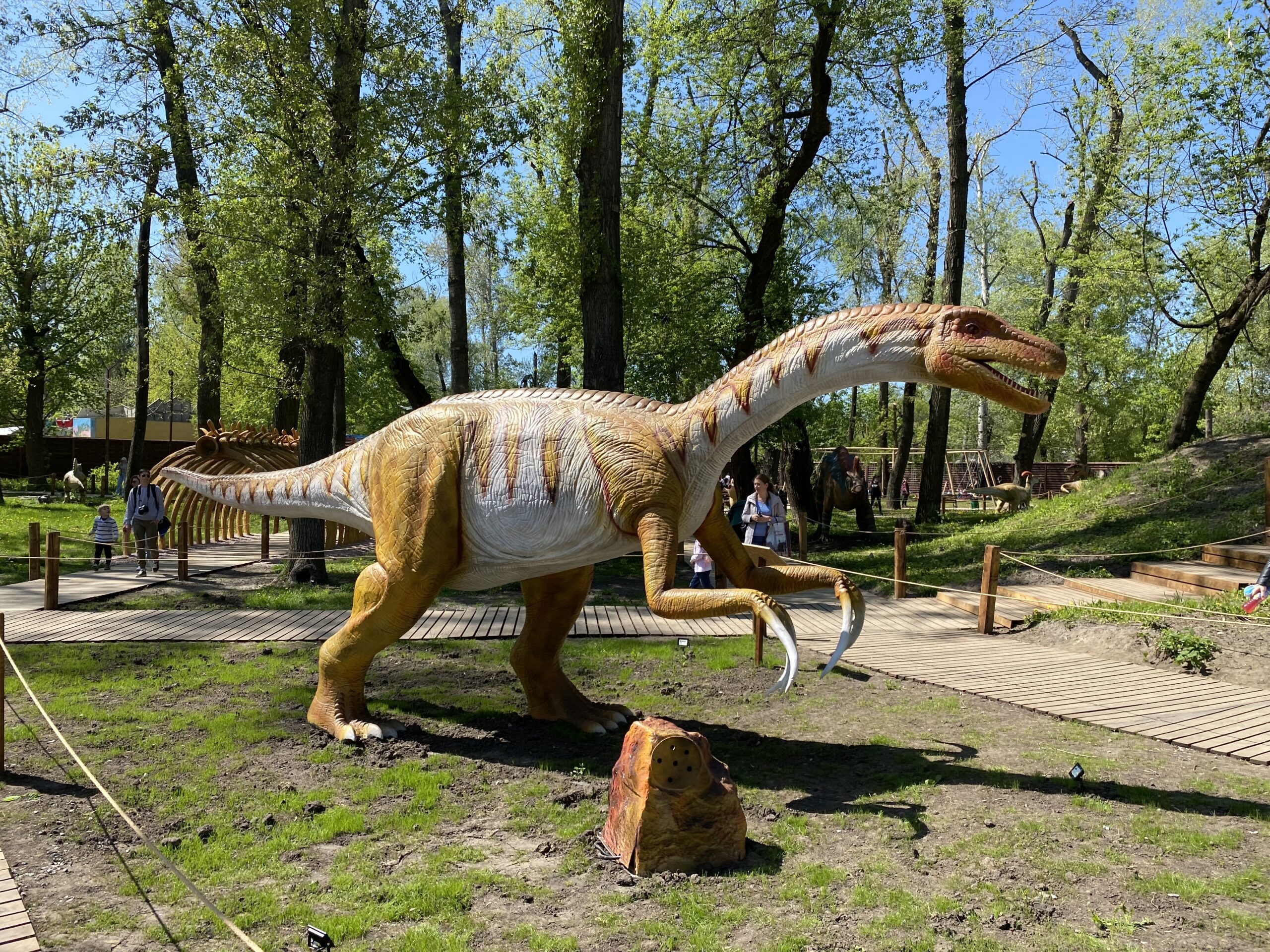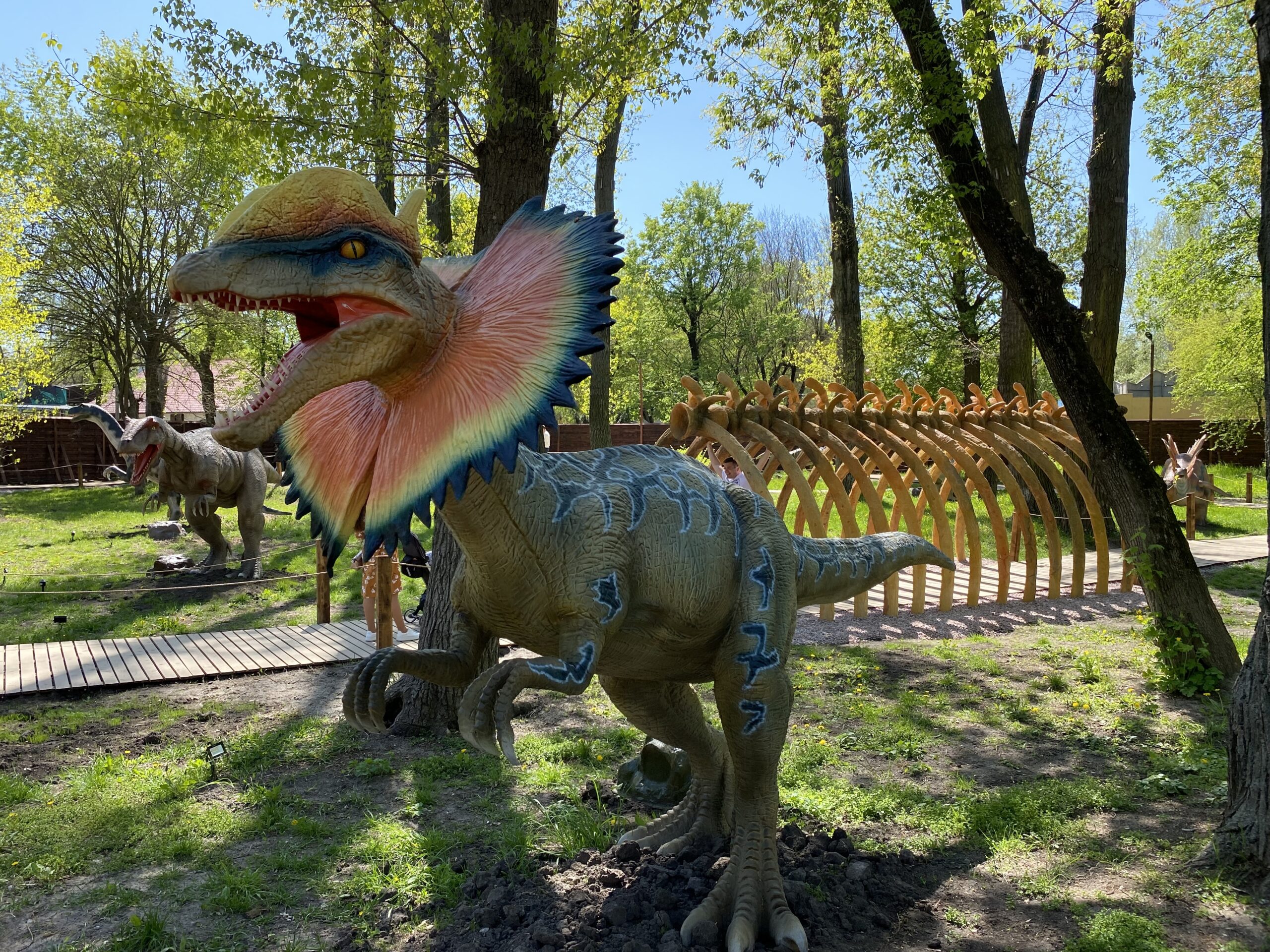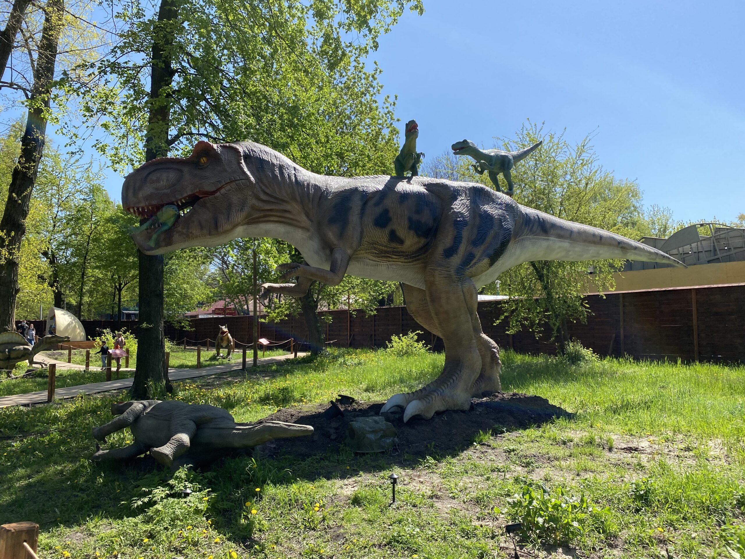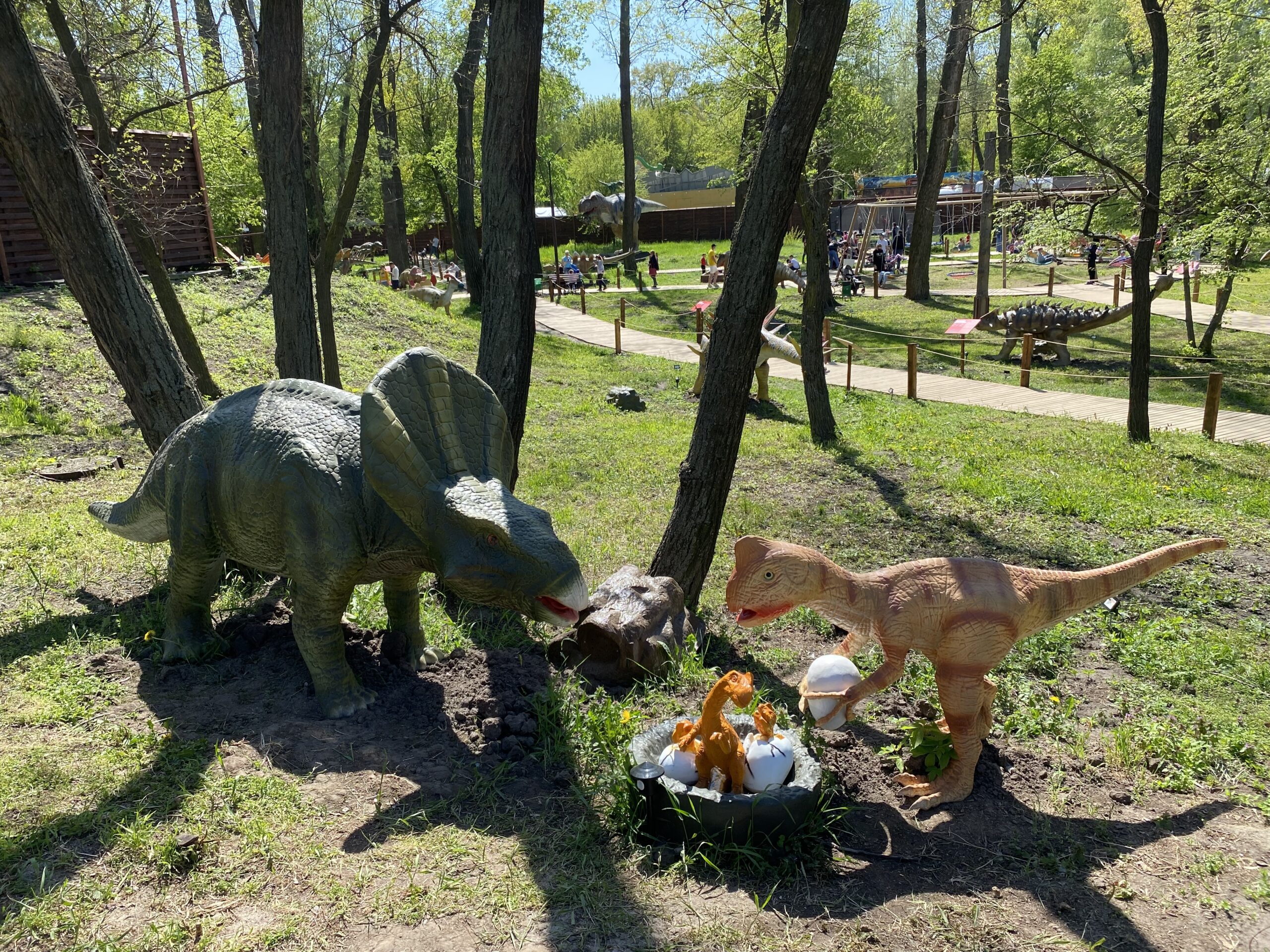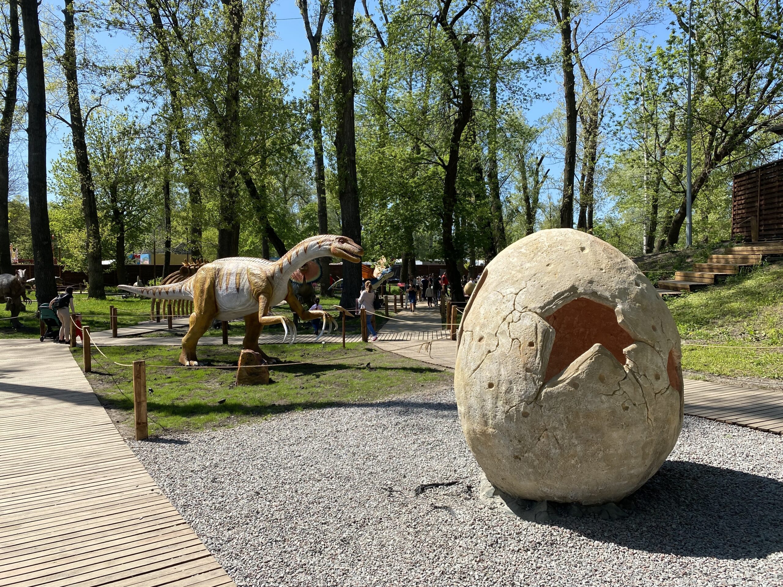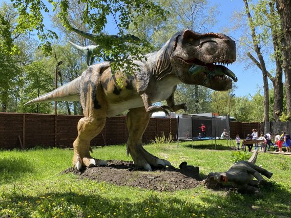 В Киеве на территории Гидропарка работает самый большой парк динозавров в Украине "Dинопарк". Посетителей на площади в 1,5 гектара ждут более 100 роботизированных фигур динозавров, животных ледникового периода реальных размеров, насекомые-гиганты.