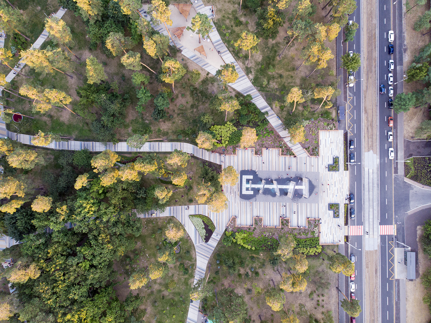 Со стороны жилого массива есть еще одна аллея, которая является верхней границей парка. Двигаясь вдоль границ озера, посреди нового парка, сразу за спортивной площадкой расположена центральная площадка с арт-объектом "мальчик и девочка".