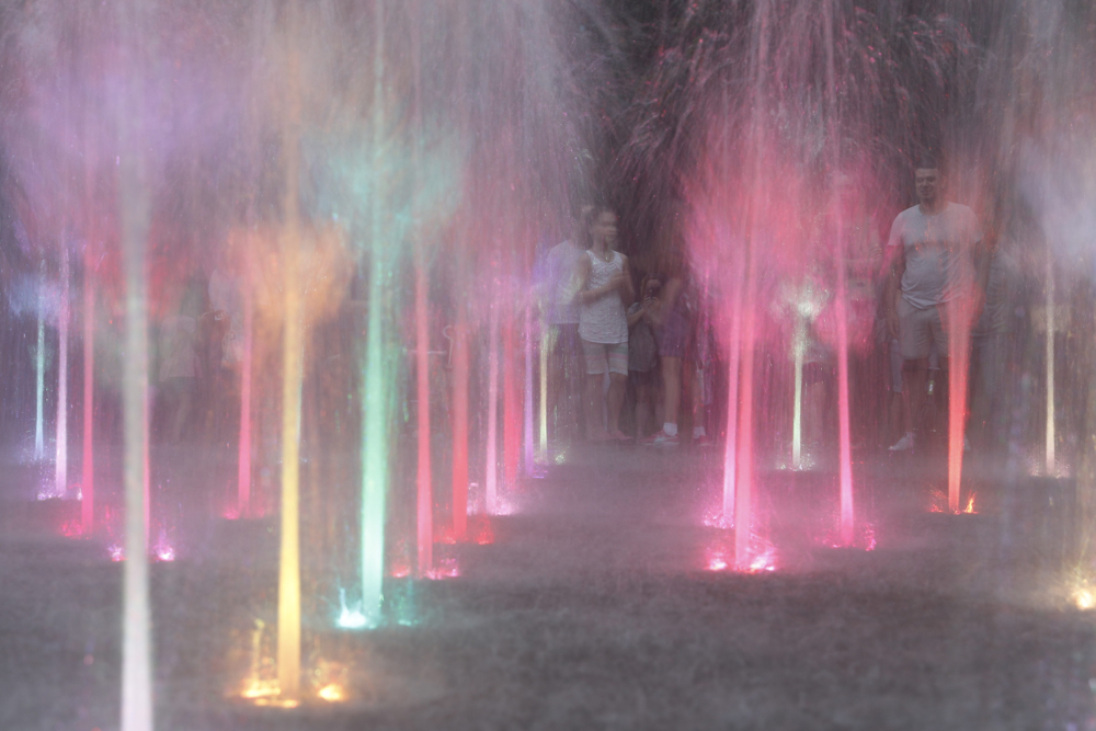В вечернее время включается подсветка. Кроме того, фонтан является интерактивным: нажимаете кнопку - и запускается другой сценарий.