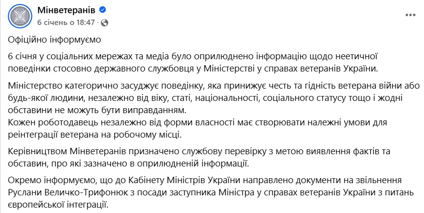 "6 января в социальных сетях и медиа была обнародована информация о неэтичном поведении относительно государственного служащего в Министерстве по делам ветеранов Украины. Министерство категорически осуждает поведение, которое унижает честь и достоинство ветерана войны или любого человека, независимо от возраста, пола, национальности, социального статуса и т.п. и никаких обстоятельств.
