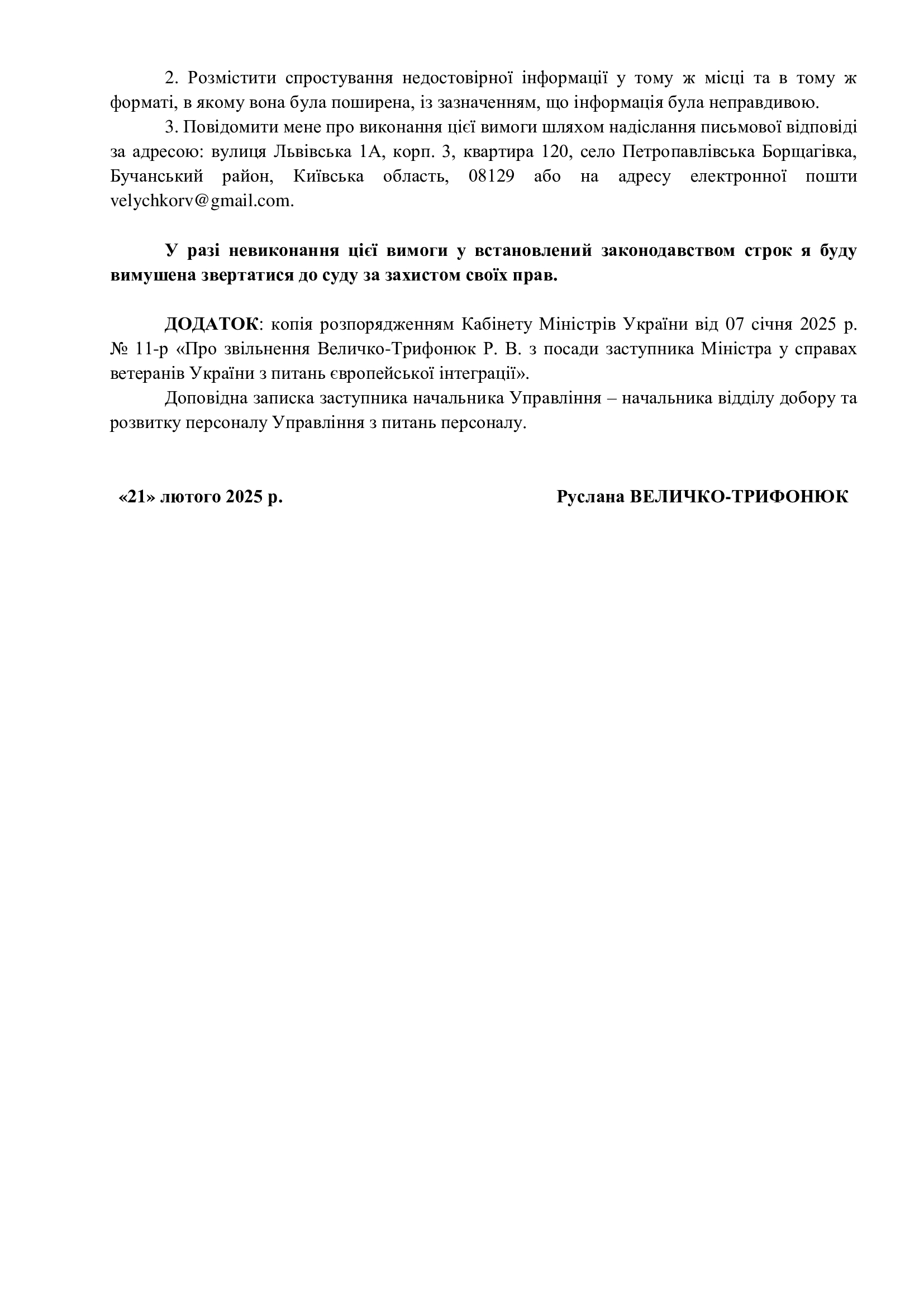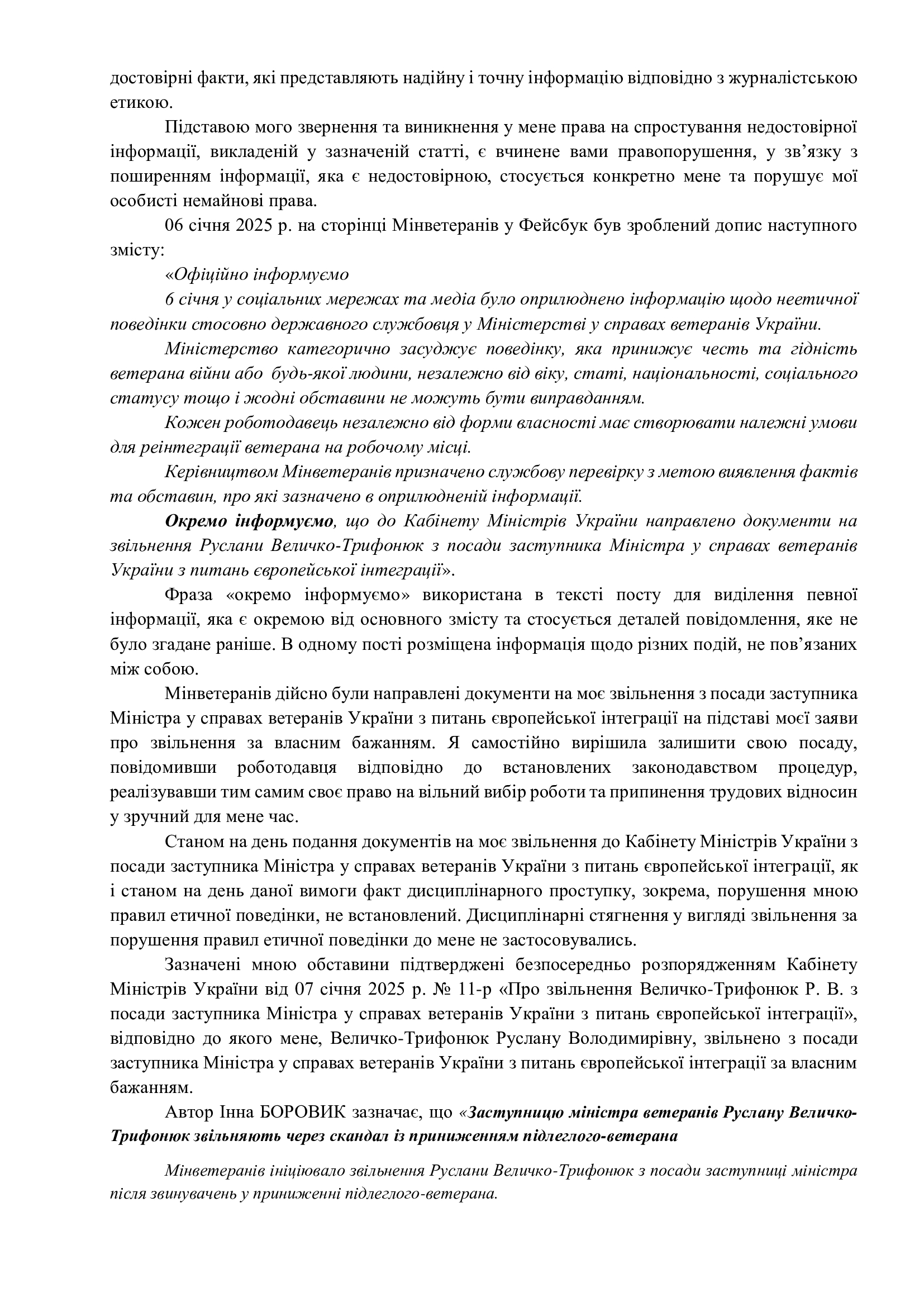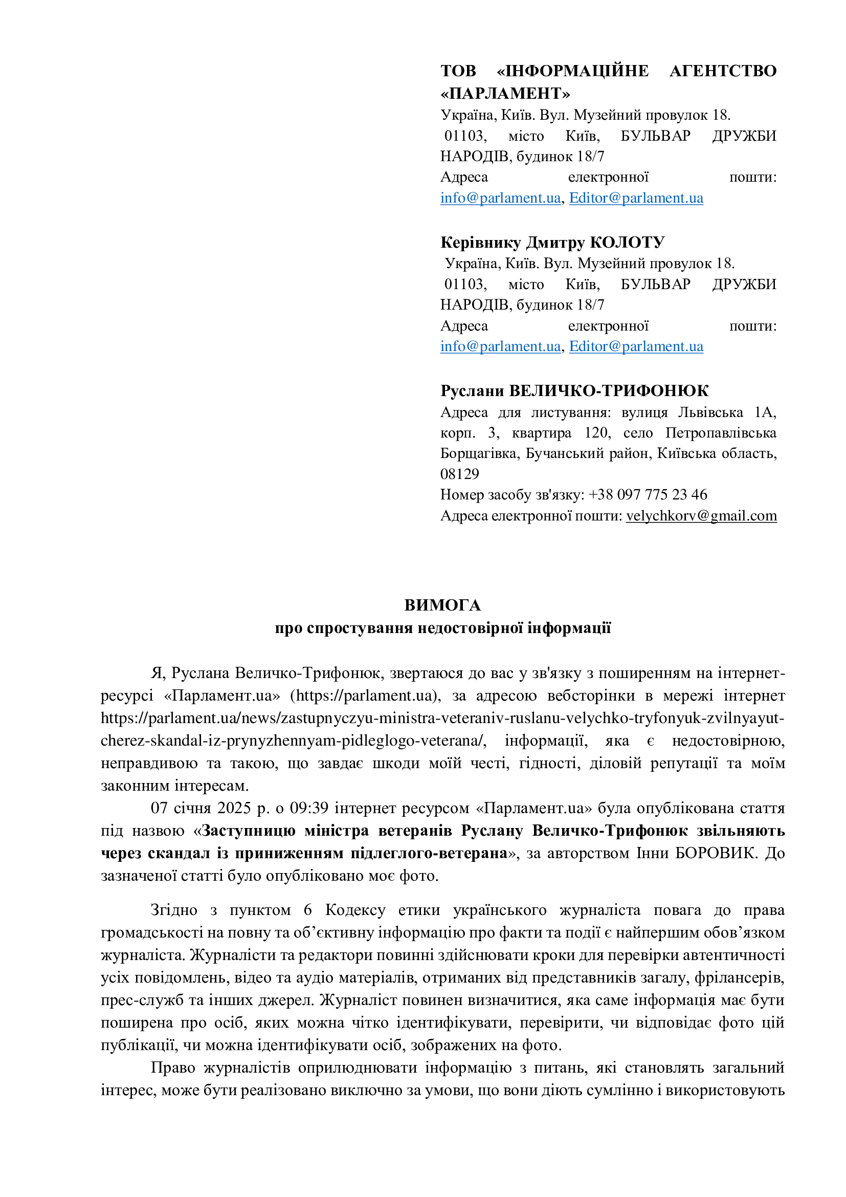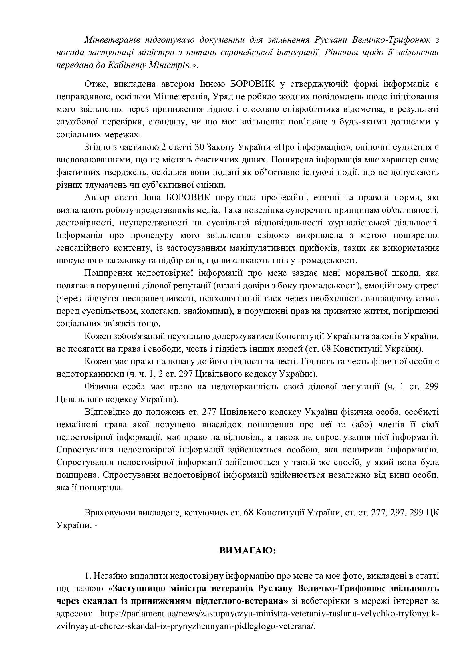 Руслана Величко-Трифонюк также обвиняла авторов материала в отсутствии профессиональности и манипулятивности и потребовала немедленно удалить распространенную информацию путем публикации в том же месте и в том же формате ее версии.