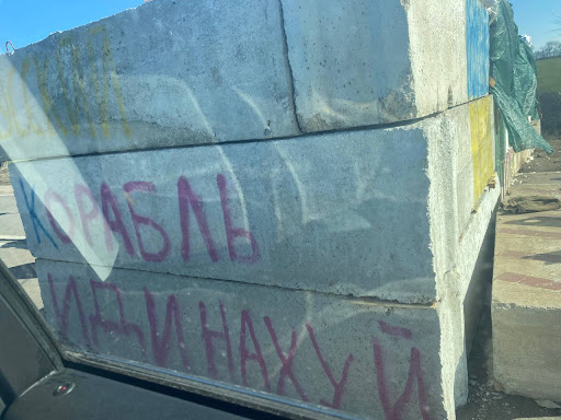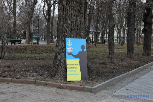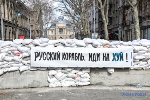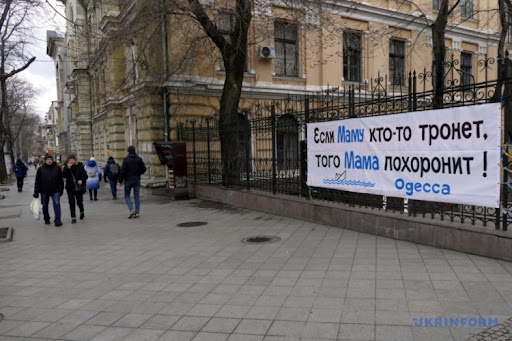 О возможной опасности в городе напоминают противотанковые ежи, блокпосты и мешки с песком, которыми обложили наиболее ценные памятники Одессы. Также на улицах Одессы разместили патриотические плакаты, которые должны напомнить москалям, что им не рады.