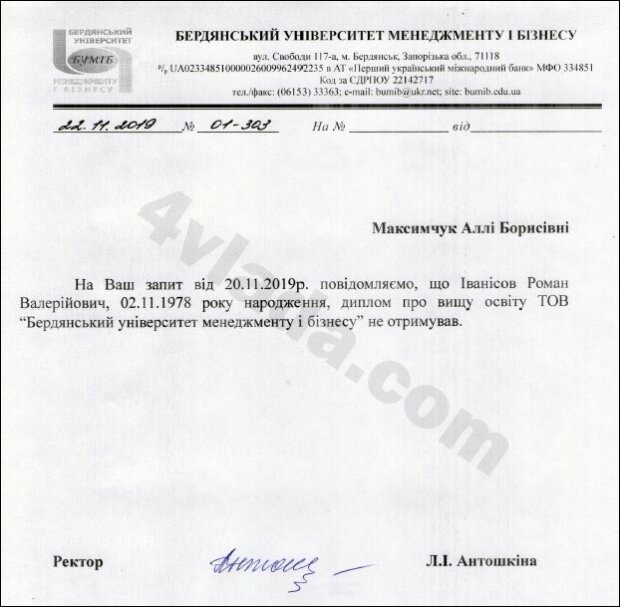 Кроме того, в своей биографии Роман Иванисов указывал, что диплом юриста он получил то в бердянском, то в запорожском вузе. При этом учился он в период с 1995 по 2000 год. Однако в “судебном приговоре Пологовского районного суда указано, что преступление Иванисов с тремя друзьями совершили в сентябре 1995 года". На тот момент, студентом Иванисов не был.